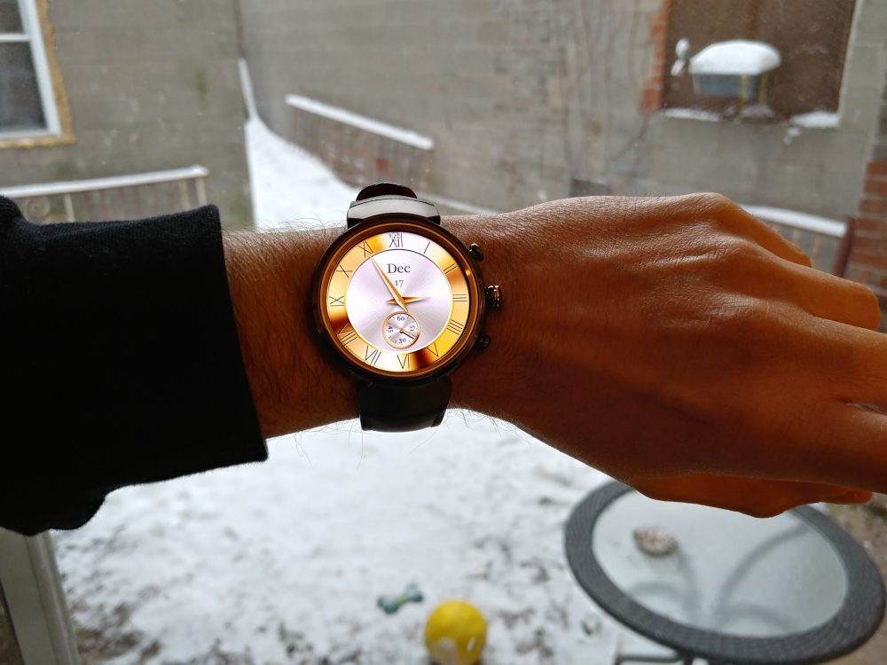 La majeure partie de l’avant du produit est donc occupée par l’écran, entièrement rond. C’est toujours appréciable alors que certains manufacturiers prennent pour acquis le fait que l’introduction d’un capteur de luminosité dans le bas de l’écran, donnant l’impression d’un « pneu à plat », n’est pas gênant. L’écran est entouré d’un cercle doré, sobrement appelé « éclipse solaire annulaire » par Asus, et qui donne un aspect haut de gamme au produit. On aime ou on déteste, mais plusieurs personnes m’ont avoué avoir remarqué ma montre grâce à celui-ci.
