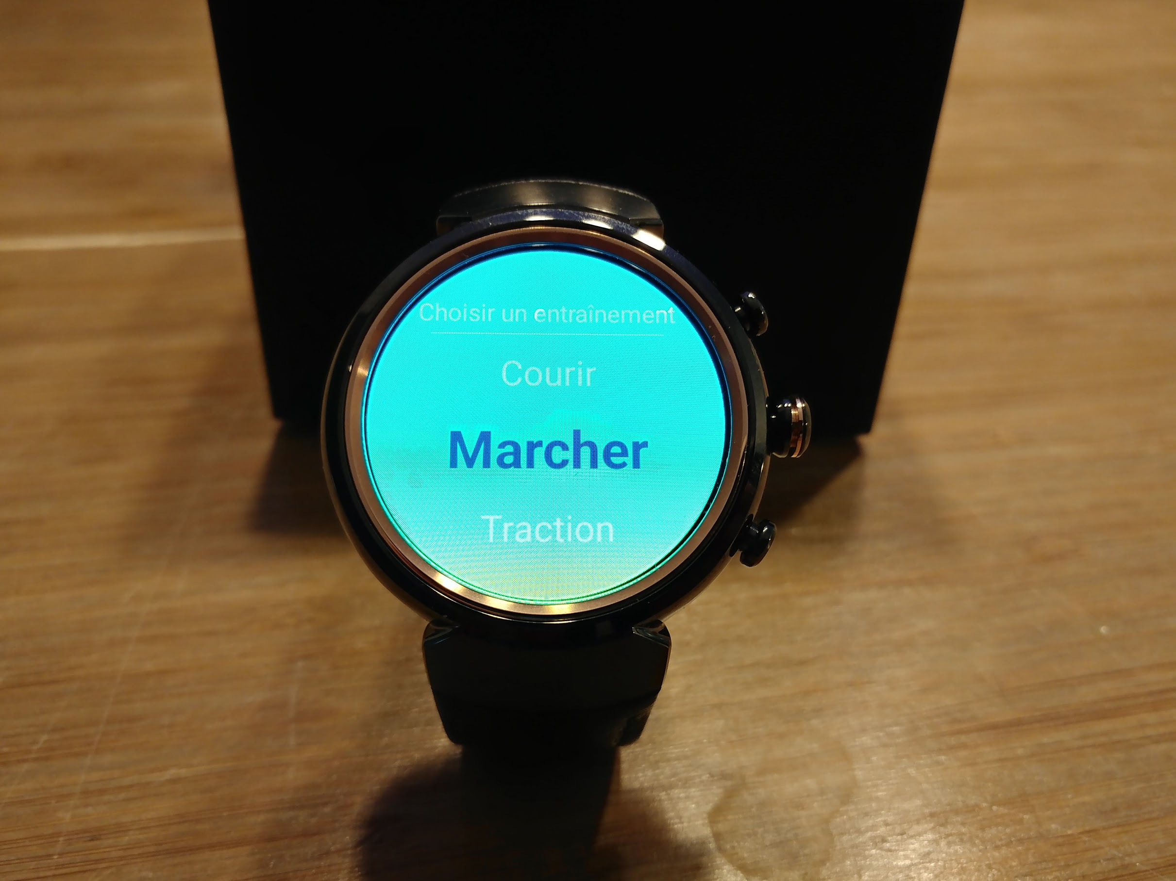 Côté logiciel, Asus a fait le choix d’intégrer un assistant sportif différent de celui d’origine d’Android Wear. On retrouve donc ZenFit, déjà disponible sur téléphone mobile, directement à son poignet. Les fonctionnalités sont classiques et permettent de mesurer l’activité tout en donnant une estimation des calories brulées en fonction du sport choisi. Le tout est ensuite affiché de manière très visuelle et intuitive. L’application n’a donc rien de révolutionnaire, mais permet d’avoir une alternative à Google Fit. Les données peuvent par ailleurs être synchronisées avec le service de Google tout en utilisant l’application d’Asus, ce qui est appréciable.