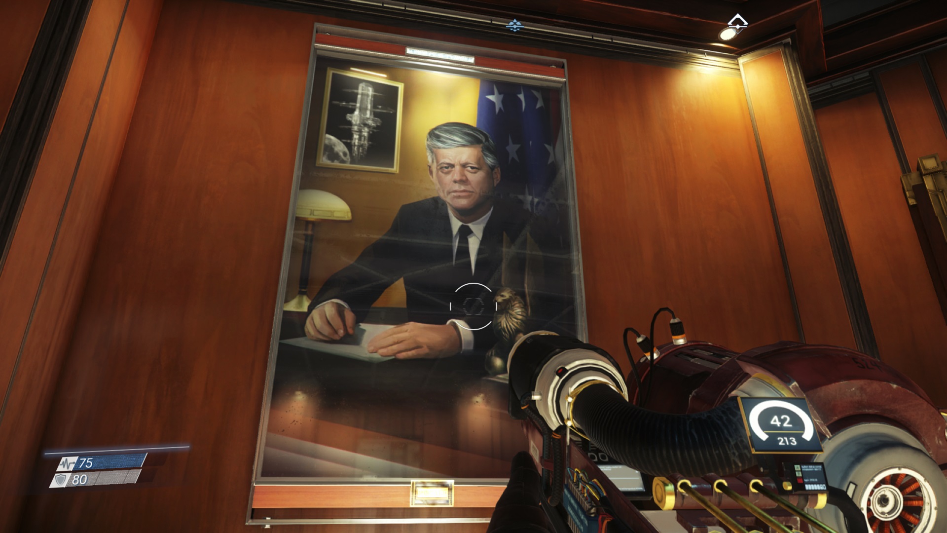 C’est justement dans cette diversité au niveau de la jouabilité que Prey brille. Les développeurs ont construit chaque niveau de manière à laisser aller l’imagination des joueurs. Par exemple, le jeu met à notre possession une petite arbalète à fléchette en mousse totalement inoffensive. Cependant, vous pouvez vous en servir pour enclencher le mécanisme de déverrouillage de porte manuel à distance comme ce fût le cas avec une salle que je ne pouvais pas ouvrir sans trouver la carte d’accès. Il a suffi de briser la fenêtre de côté pour atteindre la cible et entrer dans la pièce. Il y a même un pouvoir qui nous permet de nous transformer en Typhon afin de glisser sous des fentes qui seraient trop petites autrement ce que j’ai trouvé très ingénieux.