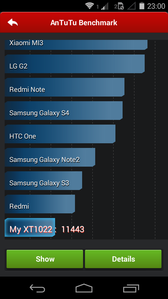 Logiquement, les benchmarks le positionnent derrière son grand frère le Moto G. Il est quand même devant le HTC One X, l’un des mobiles haut de gamme du début d’année 2012.
