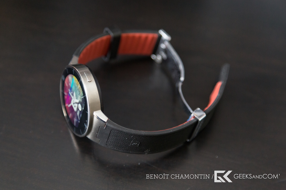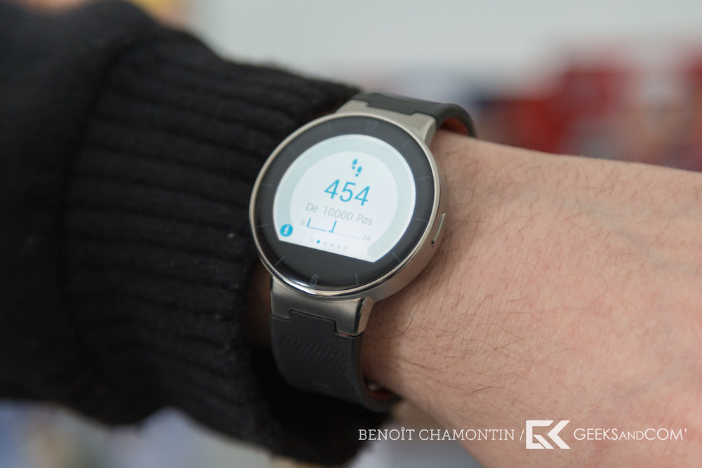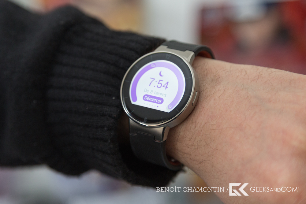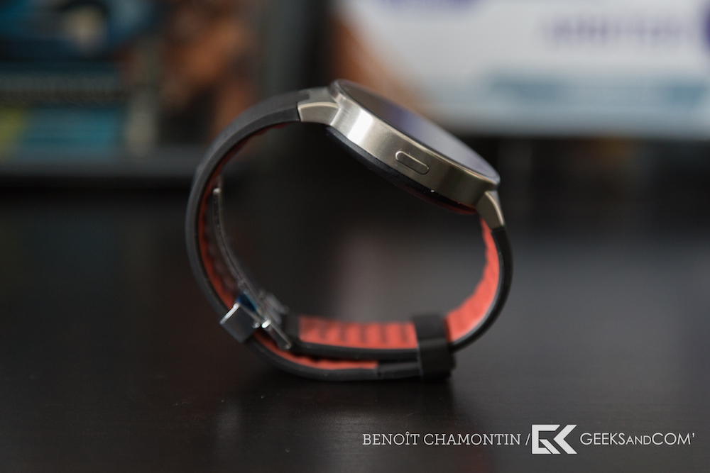 Le modèle que nous avons pu tester, et le premier qui est mis en vente par le manufacturier d’ailleurs, est celui avec le bracelet en silicone noir et orange. Bien évidemment, le rendu et le ressenti est différent lorsque l’on prend la montre en main. La finition est plutôt bonne et le bracelet rend la montre assez légère, mais on ne peut s’empêcher d’être frustrés que le modèle disponible au prix annoncé lors du CES, ne soit pas celui montré à l’époque, mais plutôt une version avec des matériaux moins nobles. Le bracelet n’étant pas interchangeable, il faudra donc bien réfléchir avant de faire son achat.