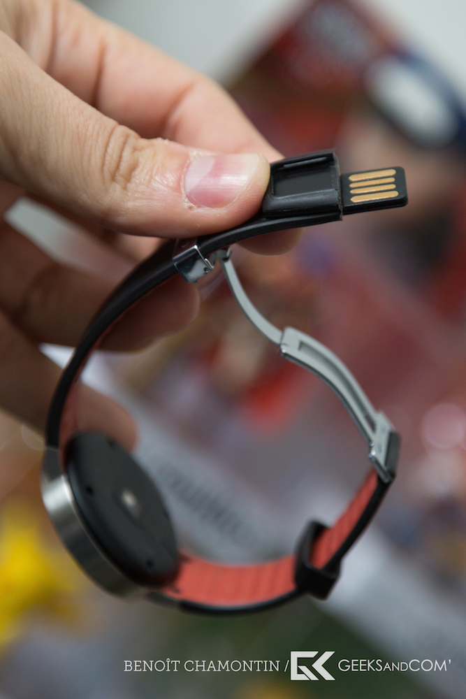 Par ailleurs, bien que l’aspect esthétique soit débattable, le fait que le bracelet contienne la prise USB pour le chargement est très pratique. Si jamais on a oublié de charger la montre, n’importe quel port USB standard à proximité sera suffisant pour remplir sa batterie. À l’heure où quasiment toutes les montres intelligentes ont un format propriétaire, c’est un vrai bonheur.