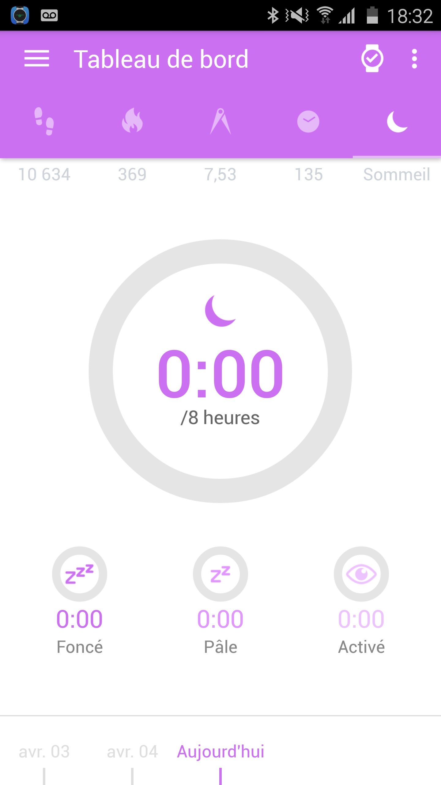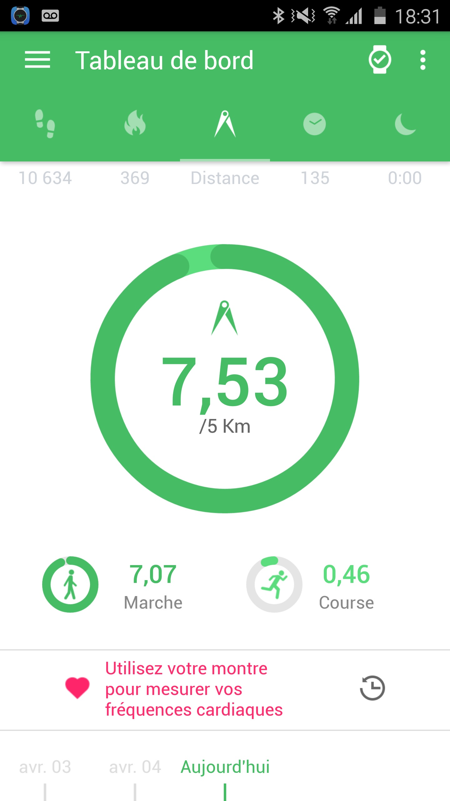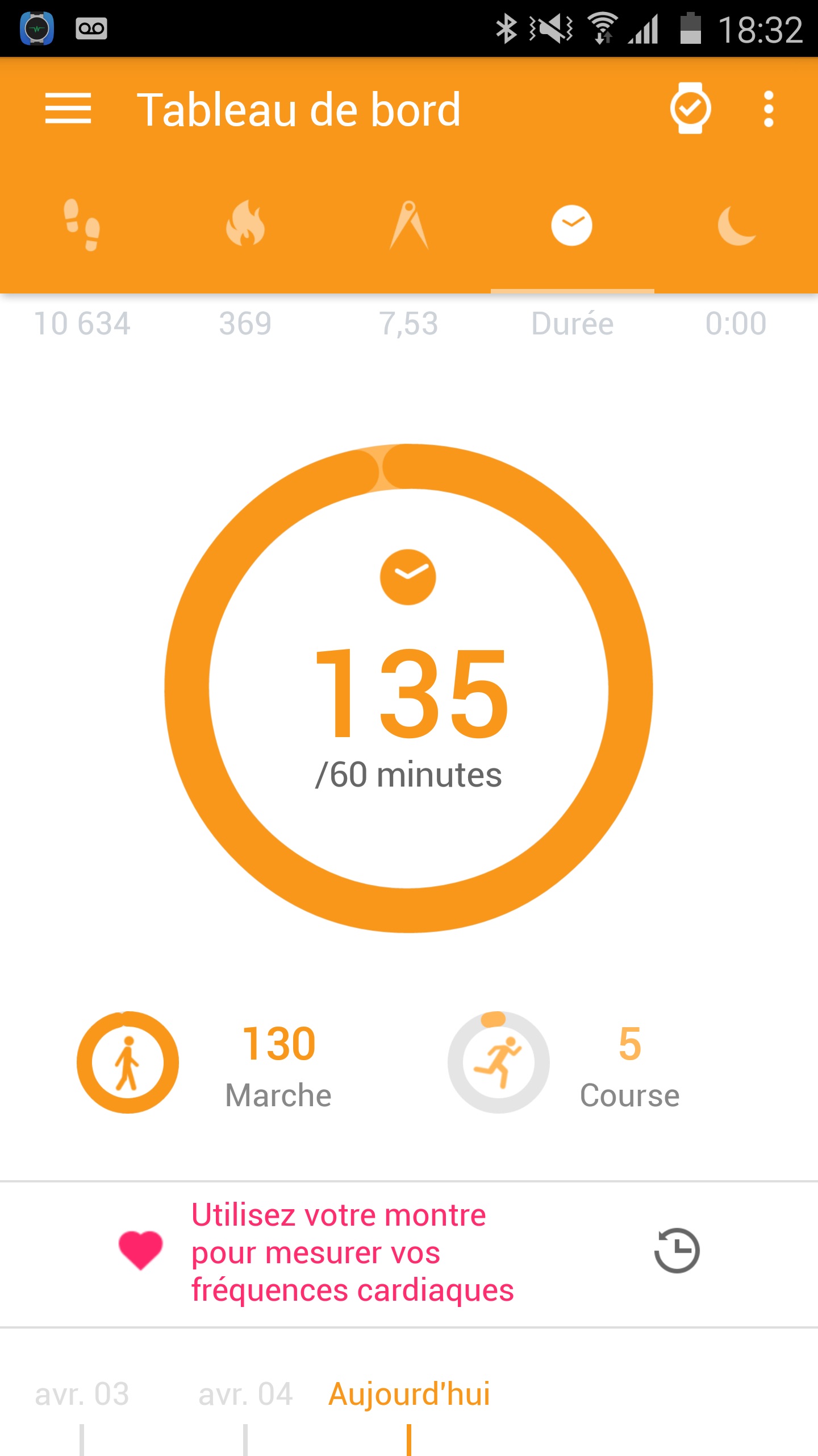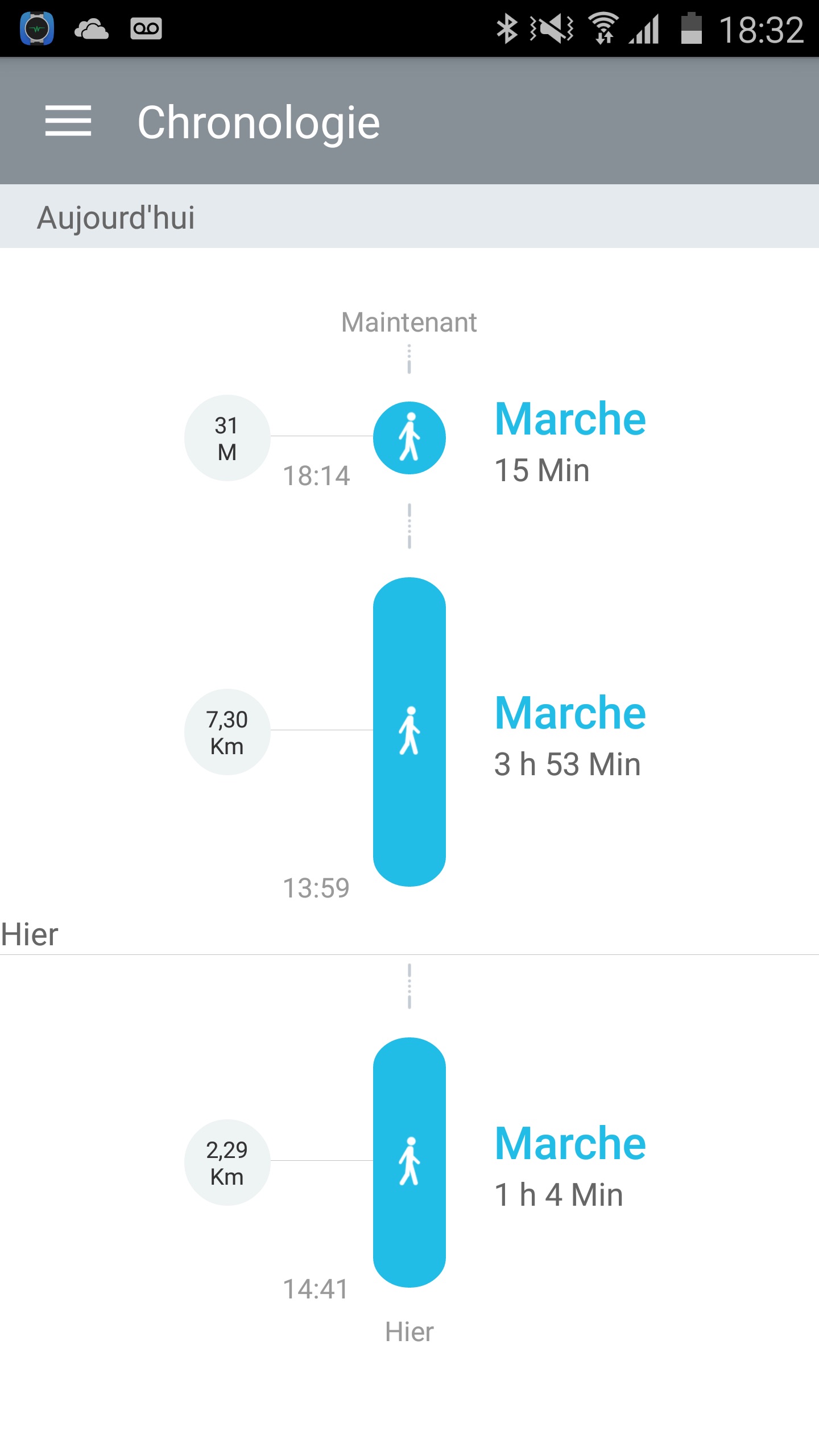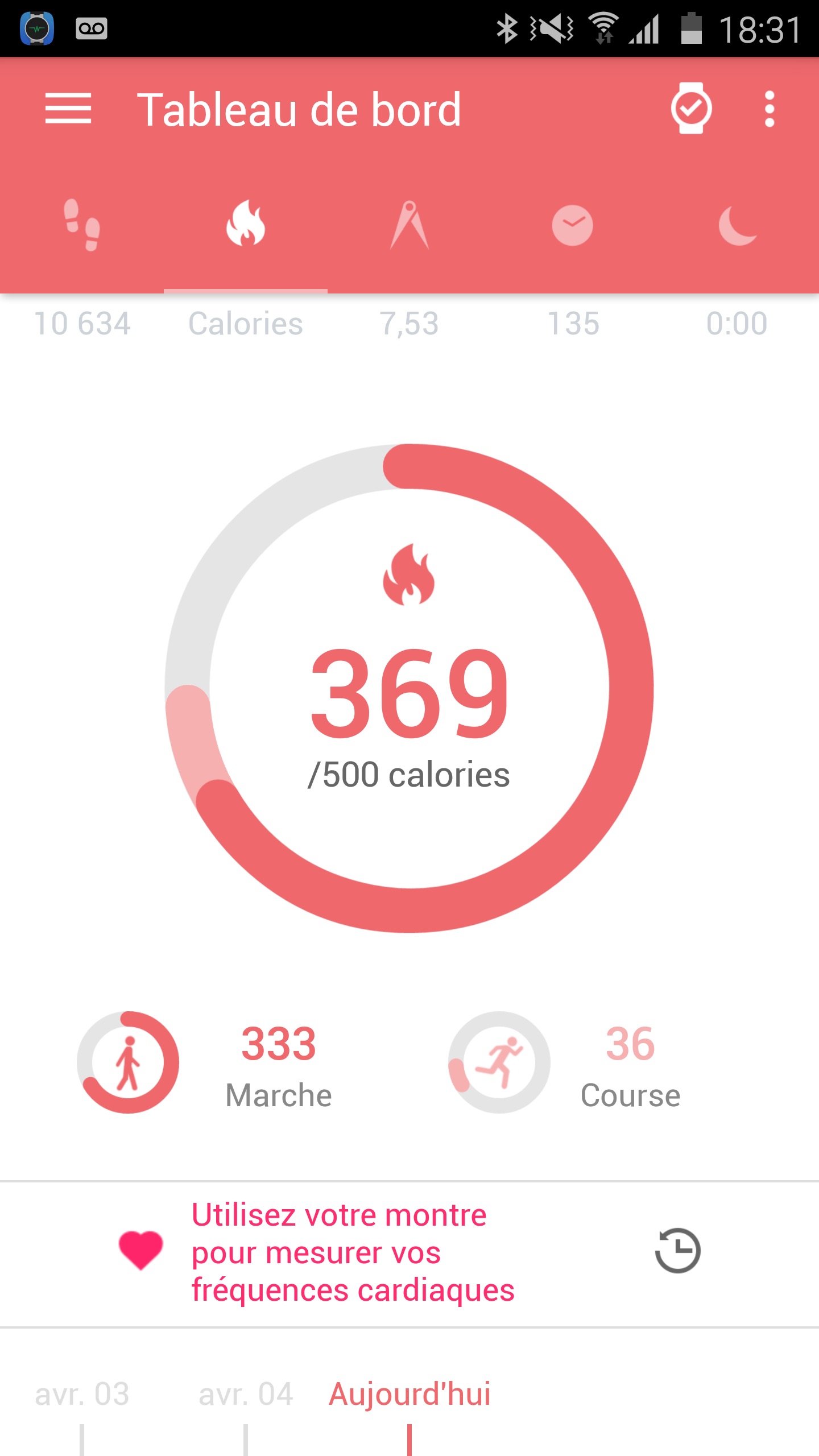 Il est également possible de visualiser le rapport d’activité, de la même manière que sur la montre. Celui-ci reprend exactement le même code couleur et l’affichage sous forme d’un cercle plus ou moins rempli selon le niveau d’atteinte de l’objectif. J’aime également beaucoup la possibilité de visualiser l’activité effectuée sous forme de ligne de temps, à la manière de ce que proposait Sony sur ses Smartband. Si cela met en évidence que le petit objet traque vraiment de manière précise notre journée, cela peut être pratique pour identifier les différentes activités.