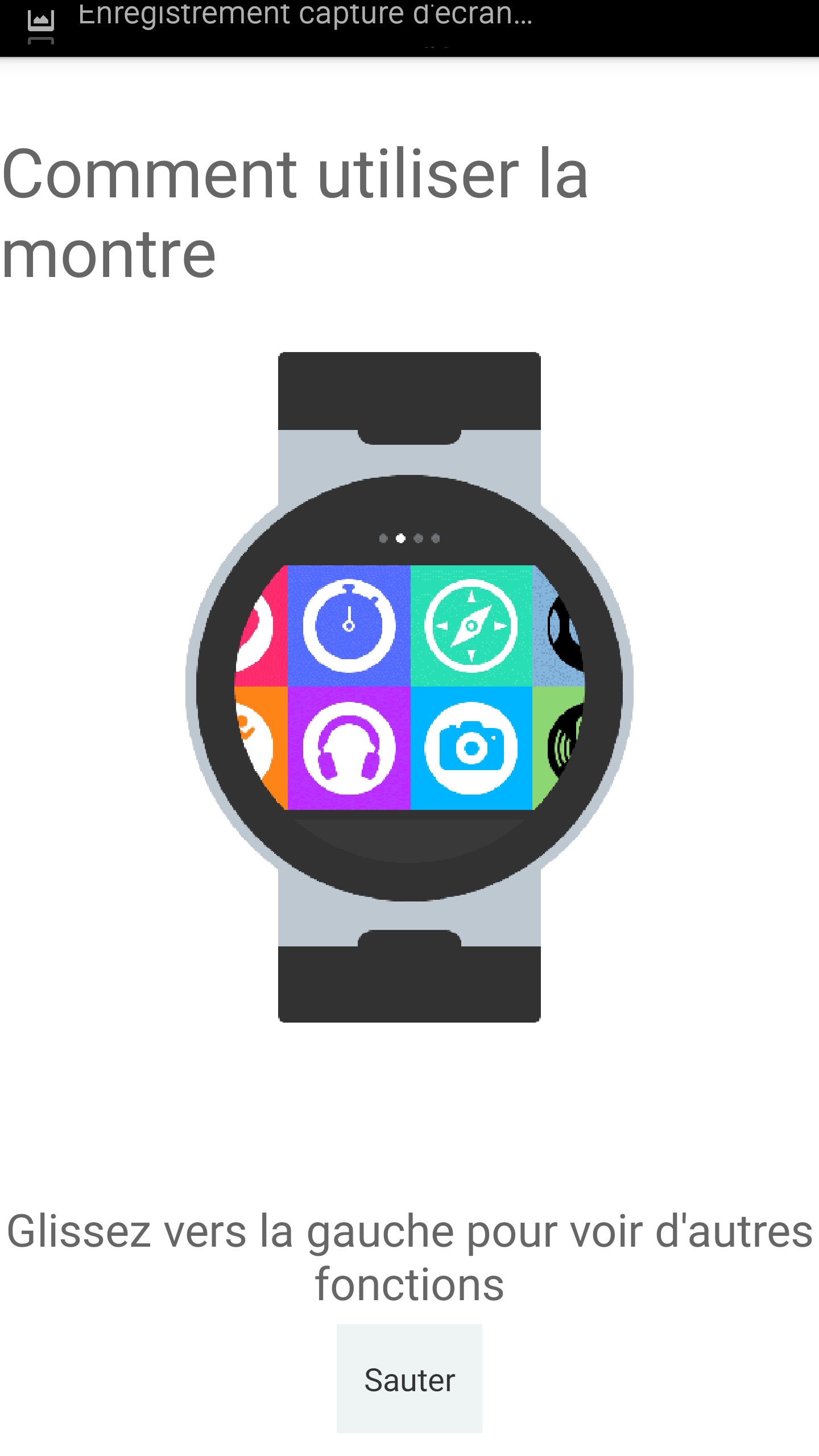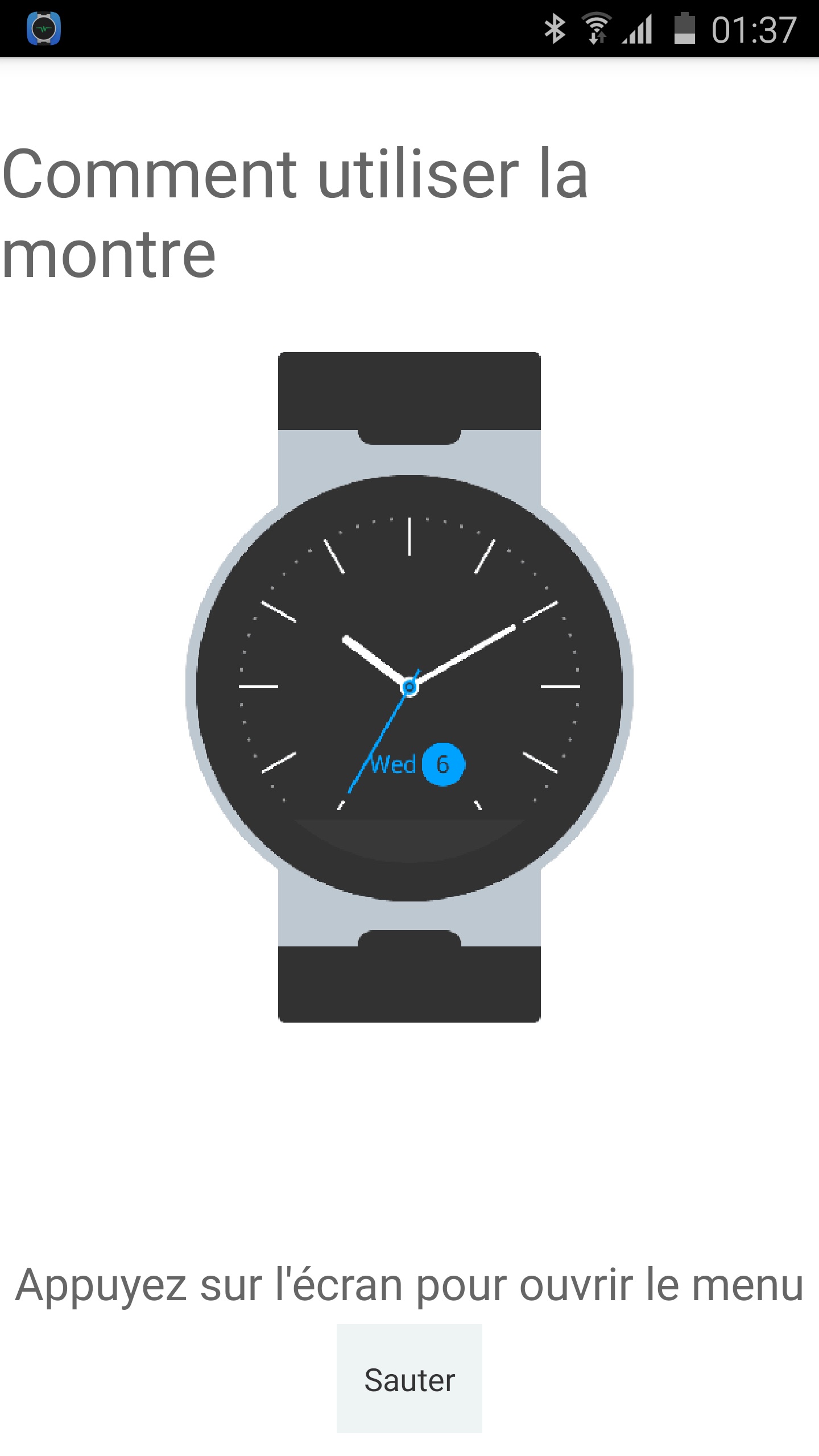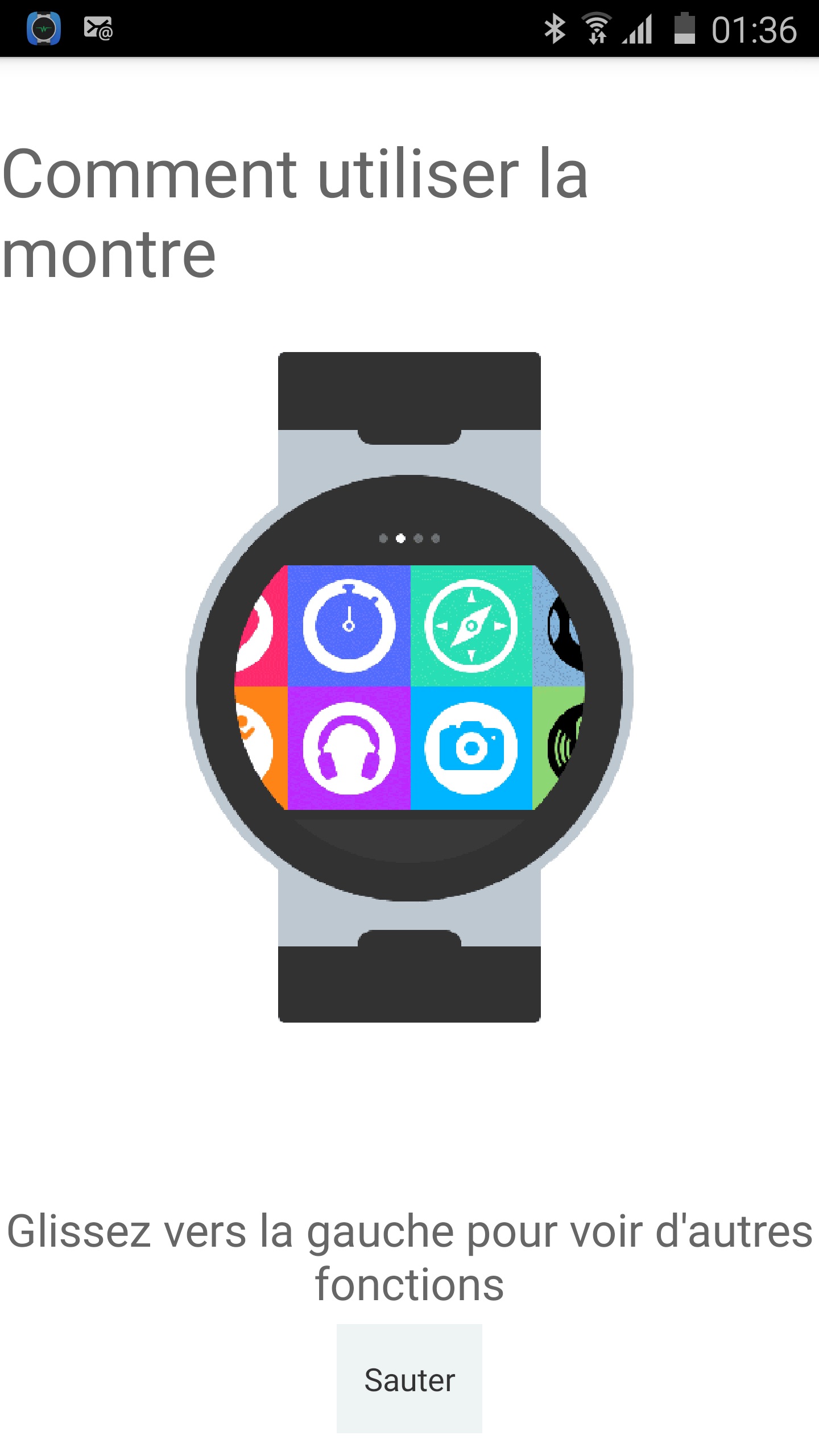 La première utilité de l’application téléchargeable sur le Play Store est de paramétrer la montre. Il est en effet impossible de faire quoi que ce soit avec l’objet tant que celle-ci n’a pas été associée en Bluetooth à un téléphone. Les quelques étapes de démarrage sont très claires, et l’application demande à avoir accès aux notifications du téléphone afin de les afficher sur son propre écran. Les habitués des montres Android Wear ne seront donc pas perdus, étant donné qu’il s’agit exactement du même parcours.
