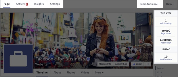 Le menu de navigation est assez classique en haut et permet d’accéder à la page, aux activités, statistiques, paramètres. Il y a également un accès direct à son compte de gestion des publicités avec l’onglet « build audience ».