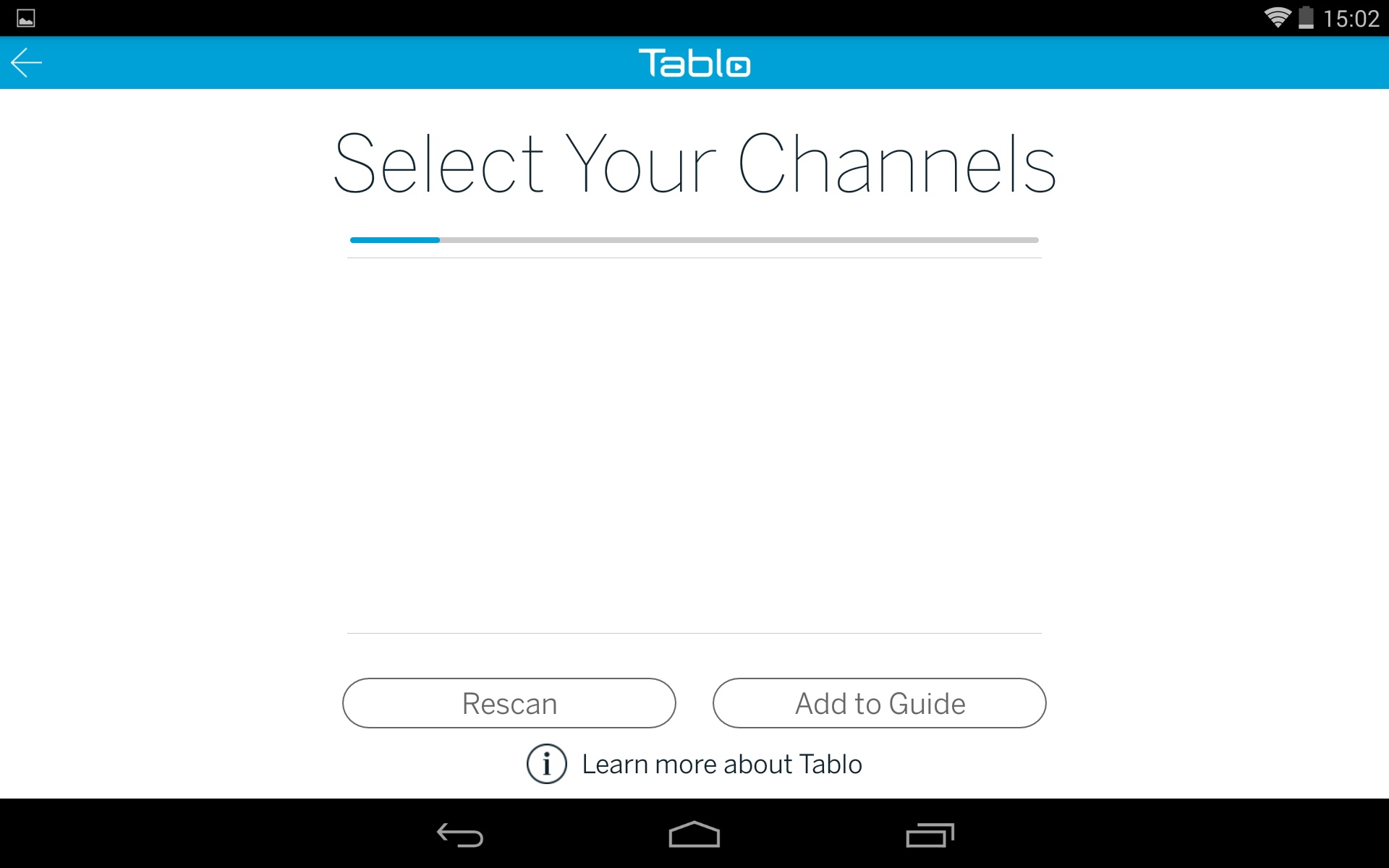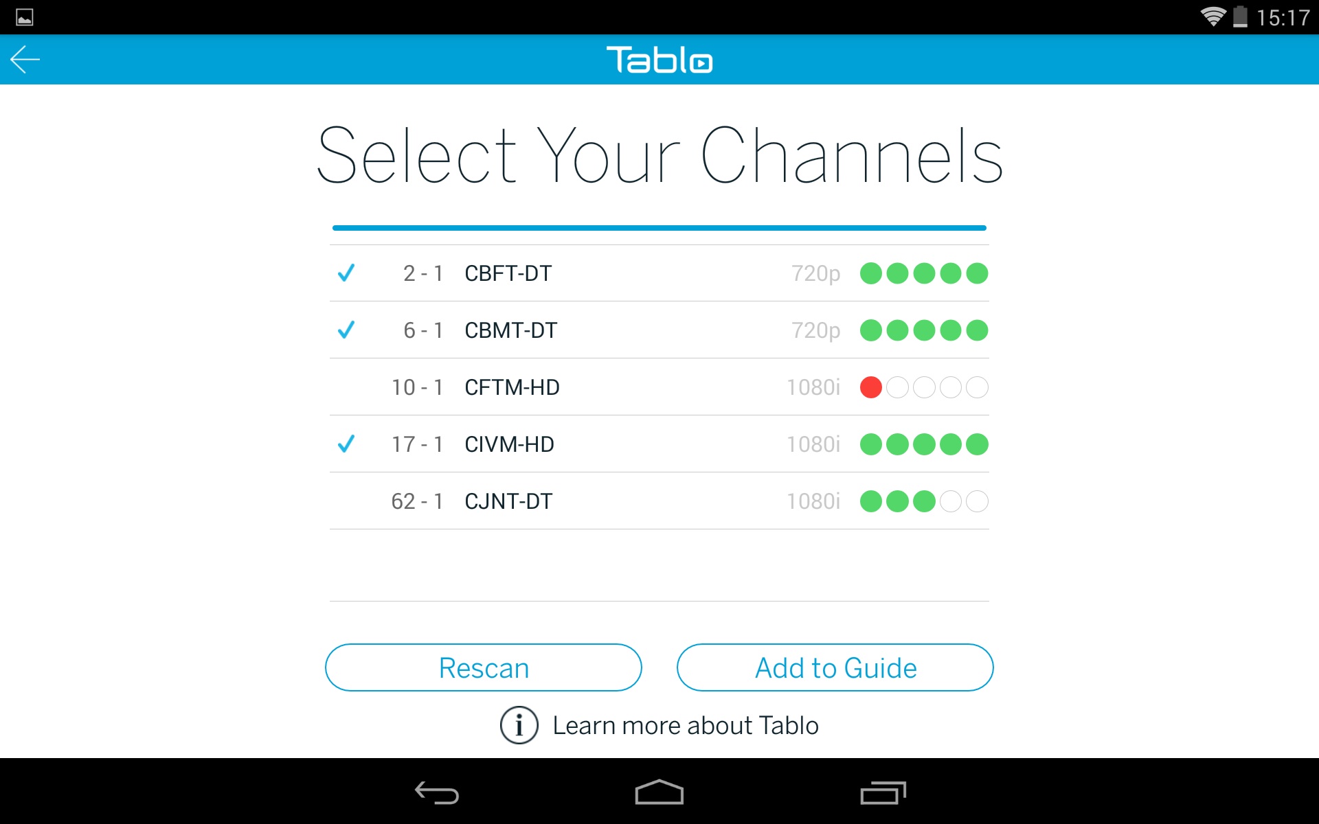 Une fois l’application Tablo téléchargée, sur le Google Play Store ou l’App Store d’Apple, un assistant guide l’utilisateur pour les premiers réglages, tels que le scan des chaînes disponibles et la connexion au Wi-Fi si ce choix a été fait. Les chaînes de télévision reçues sont affichées avec un indicateur de qualité du signal, ce qui est très pratique.