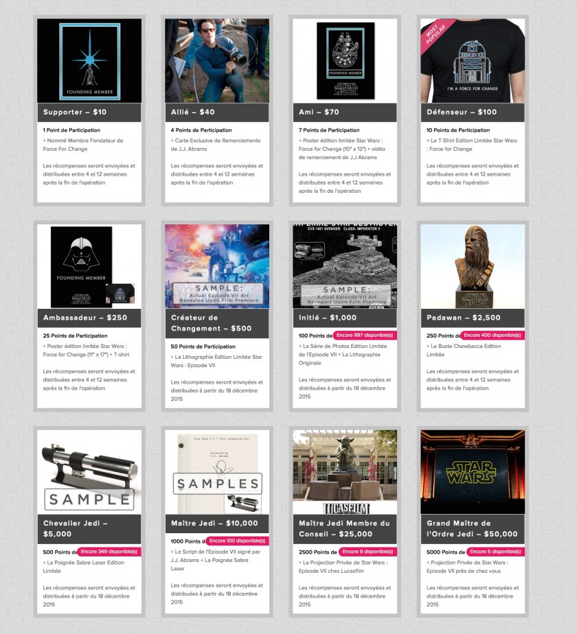 En effet, via la page dédiée www.Omaze.com/StarWars, il est possible de faire un don à l’UNICEF compris entre 10 et 50 000$. Chaque palier de don permet d’obtenir une récompense allant de posters et tshirts en éditions limitées jusqu’à une projection privée du film ou un buste de Chewbacca et une poignée de Sabre Laser notamment.