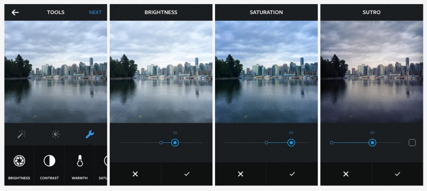 Pour chaque photo, il est maintenant possible d’ajuster la luminosité, le contraste, la chaleur de l’image et la saturation. Ces nouveaux outils d’édition d’image sur Instagram seront accessibles au moment de choisir un filtre.
