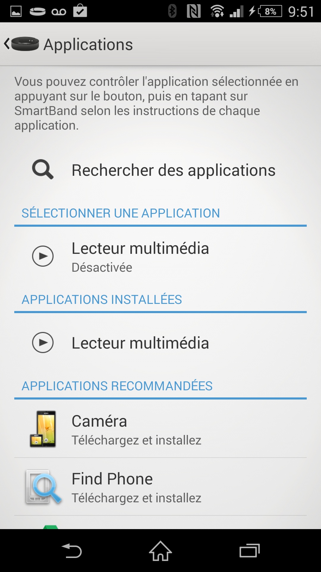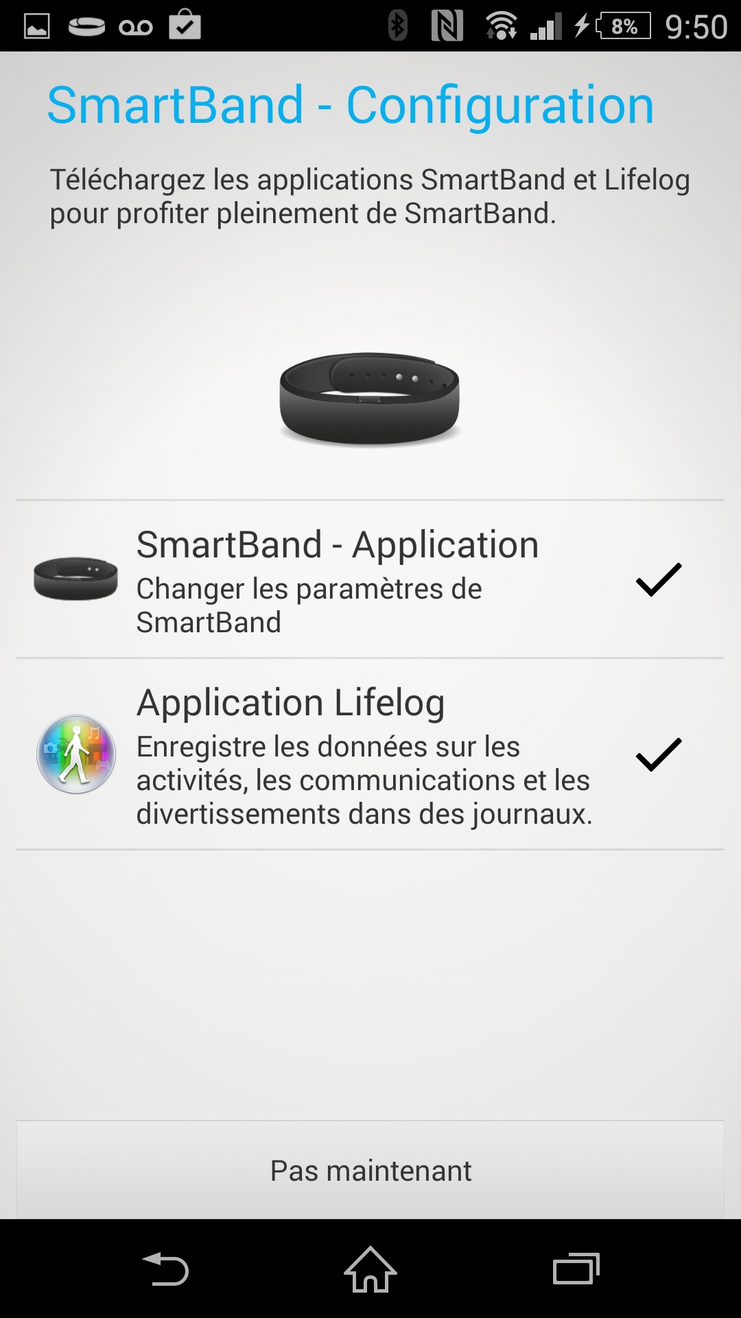 Deux applications sont nécessaires à la bonne utilisation du bracelet de Sony. La première, sobrement intitulée « Smart Connect », donne à l’utilisateur la possibilité de changer les réglages principaux du bracelet. Une fois le bracelet connecté, une icône reste présente constamment dans la barre de notifications du téléphone pour informer de l’état de l’accessoire.