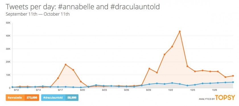 Le hashtag #Annabelle fait sa place durant le mois d’octobre sur la twittosphère. Si nous comparons par exemple un autre film d’horreur sorti en salle à pareille date, Dracula Untold, celui-ci possède près 2,5 millions d’abonnés sur Facebook par rapport à 2,4 millions d’abonnés pour Annabelle (qui, toutefois, suscite plus d’engagement en termes de likes, commentaires et partages). Par contre, dans le dernier mois, le hashtag #Annabelle a entraîné près de 250 k mentions comparativement à seulement 60 k pour la hashtag #DraculaUntold.