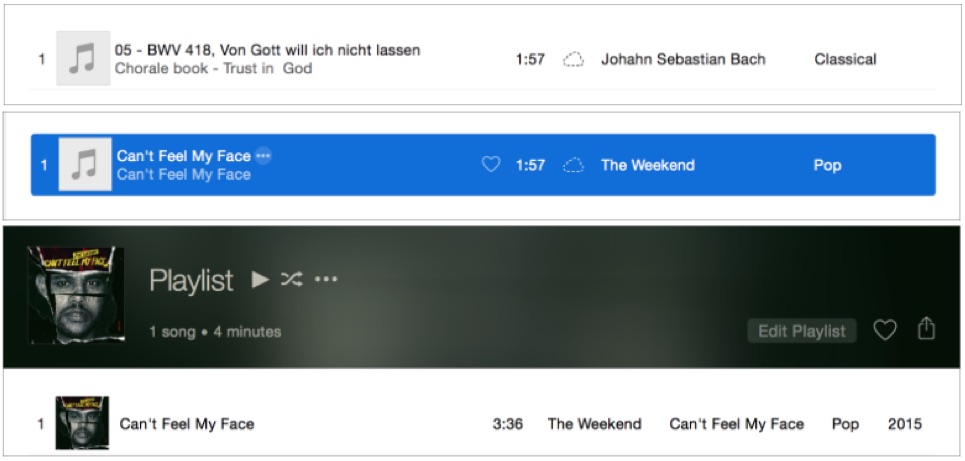 Kirk McElhearn a ainsi fait plusieurs essais afin de vérifier la situation. Le premier consistait à prendre un morceau de Bach, d’une durée de 1mn57, et de le renommer en Can’t Feel My Face de The Weekend. Apple Music a indiqué que tout s’était bien passé pour l’identification et le morceau local a donc été supprimé afin de le retélécharger et voir si l’identification était fonctionnelle. Une fois le morceau téléchargé, il s’agissait du titre de The Weekend, d’une durée de 3 min 36 s Apple n’utilise donc même pas la durée du morceau pour valider s’il pouvait s’agir d’une erreur. Le deuxième essai, portant sur un extrait de Royal Shakespeare Company, extrait directement d’un CD, est encore plus flagrant. Il est ainsi passé d’1 min 25 s à 18 min 4 s lorsqu’il a été renommé en un titre de Grateful Dead.