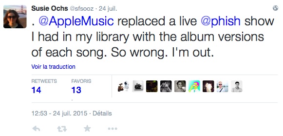 Susie Ochs, éditrice de MacWorld a par ailleurs relaté une mésaventure similaire, lorsque Apple Music a remplacé un disque live de Phish par les morceaux en version album. Cela a d’ailleurs été pour elle suffisant pour arrêter d’utiliser le service.