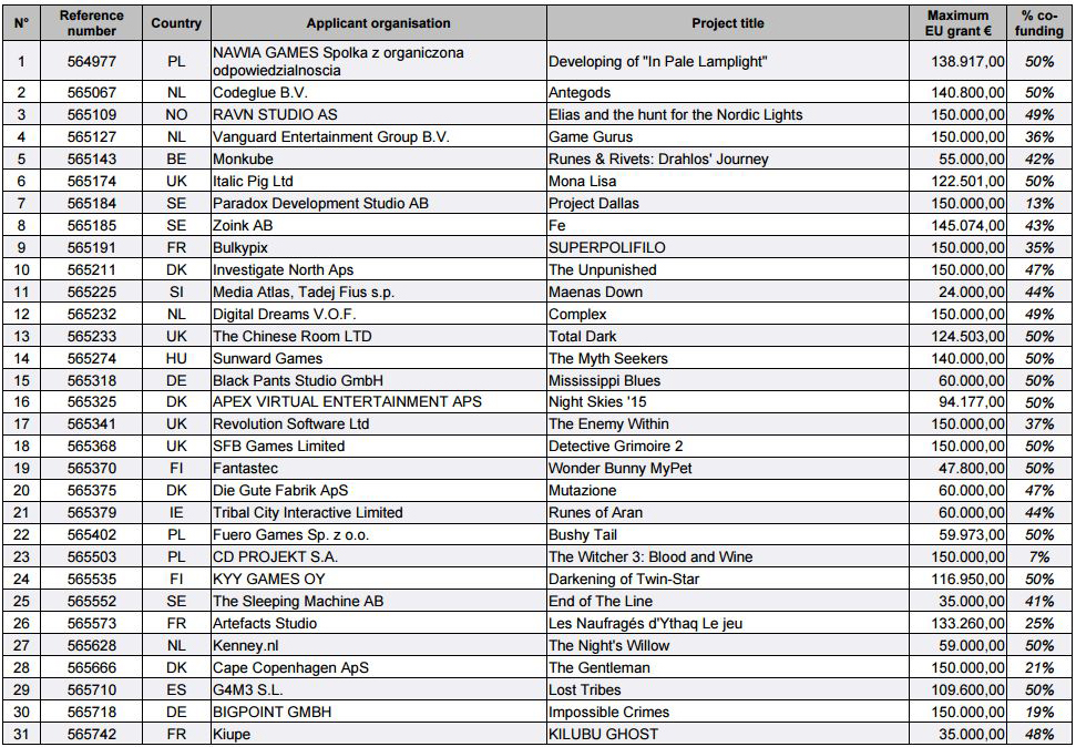 En effet, ce ne sont pas moins de 31 studios de développement qui ont bénéficié, durant l’année en cours, d’une aide totale de 3,4 millions d’euros. Ces studios, de tailles et d’ambitions très variées ont été éligibles à cette aide au terme d’une sélection draconienne et parfois même un peu floue. Tout d’abord, les studios se lançant dans l’aventure d’un premier jeu ne peuvent pas prétendre au moindre sou, le programme Europe Creative posant comme condition première d’avoir développé et commercialisé un titre dans les deux ans précédant la demande de subvention. Parmi ces studios, on notera la présence de CD Projekt qui a obtenu 150.000 euros d’aide pour Blood & Wine, la première extension de The Witcher 3 soit 7% du coût total. Cela nous permet de savoir que la première extension, disponible courant octobre a coûté environ 2.142.900 euros au studio polonais. Voici pour satisfaire votre curiosité l’ensemble des studios ayant bénéficié de l’aide du programme Europe Creative