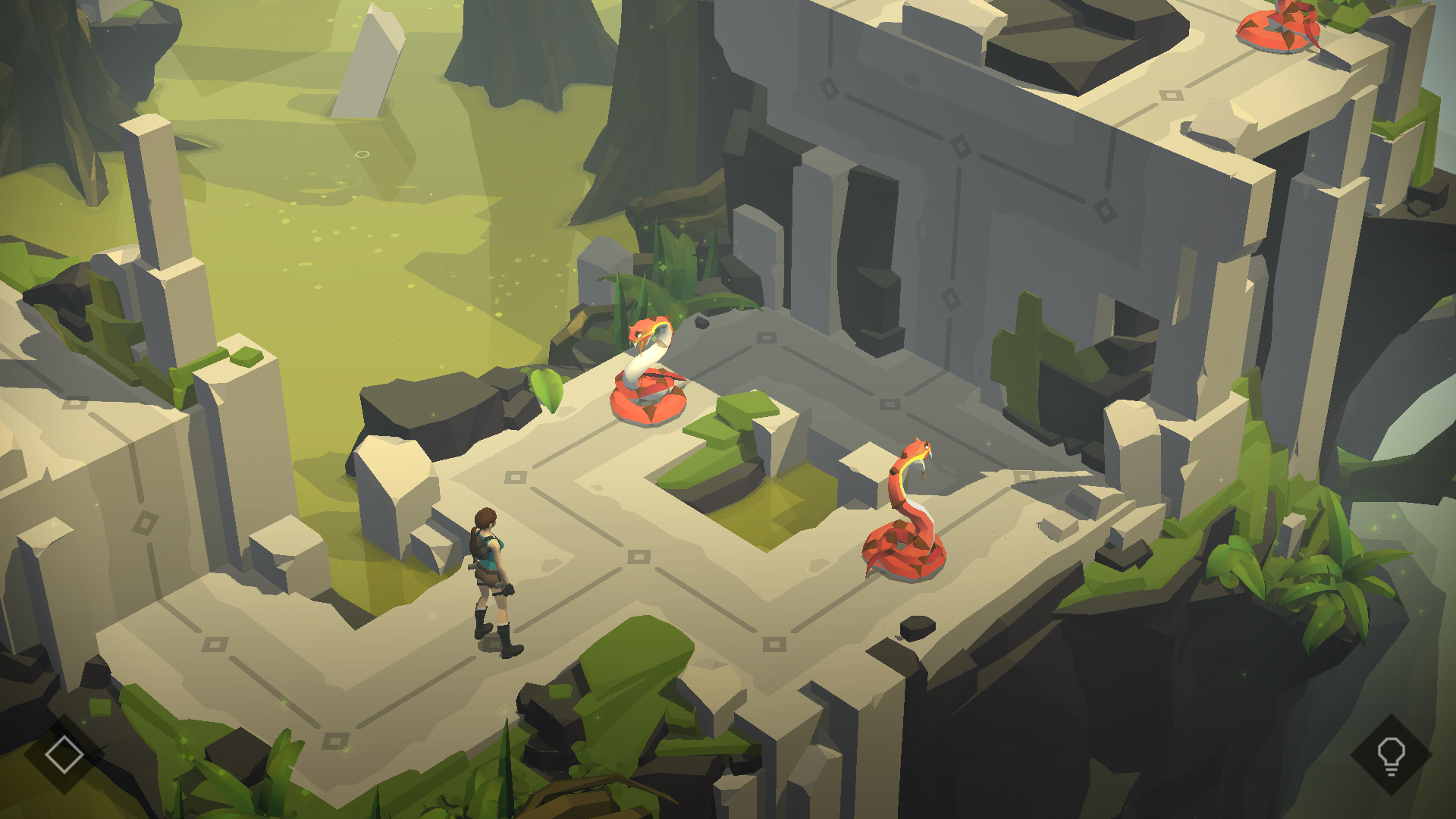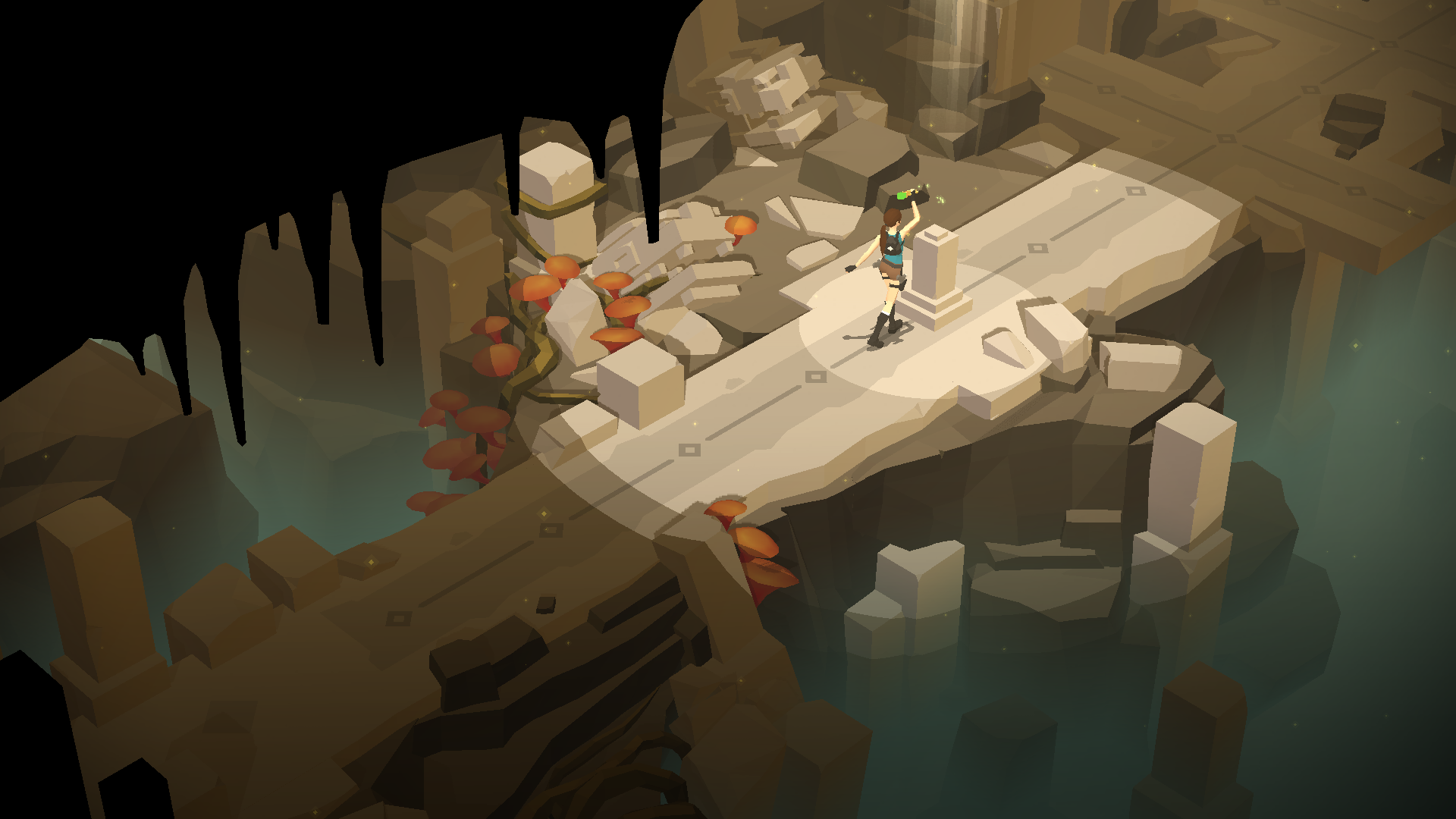 La technique du cell-shading est bien connue des joueurs ayant passé de nombreuses heures à arpenter l’océan de The Legend of Zelda : The Wind Waker. Lara Croft Go reprend le parti de Hitman Go en choisissant une 3D isométrique cell shadée pour un rendu extrêmement propre. Mais à la différence de Hitman Go, Lara Croft Go possède des environnements beaucoup plus détaillés et vivants. Les aplats de couleurs font parfaitement ressortir l’ambiance des zones explorées. Ainsi, qu’on soit dans la jungle, dans un grotte ou dans un temple, chaque environnement est parfaitement identifiable et possède une ambiance propre marquée. La beauté du rendu passe par ces aplats mettant en lumière différents plans. La présence de couleurs marquées, de falaises en premier ou arrière plan, le tout enrichit par quelques effets lumineux donnent un excellent résultat. Egalement, afin de rendre l’espace plus vivant, les niveaux s’accompagnent d’animations d’éboulement, de petites bestioles se baladant, le tout servit par une musique d’ambiance discrète renforçant à la fois le sentiment de solitude et l’aspect vivant des niveaux. Les animations des monstres et de Lara sont tout aussi réussies, avec même quelques clins d’œil pour les fans.