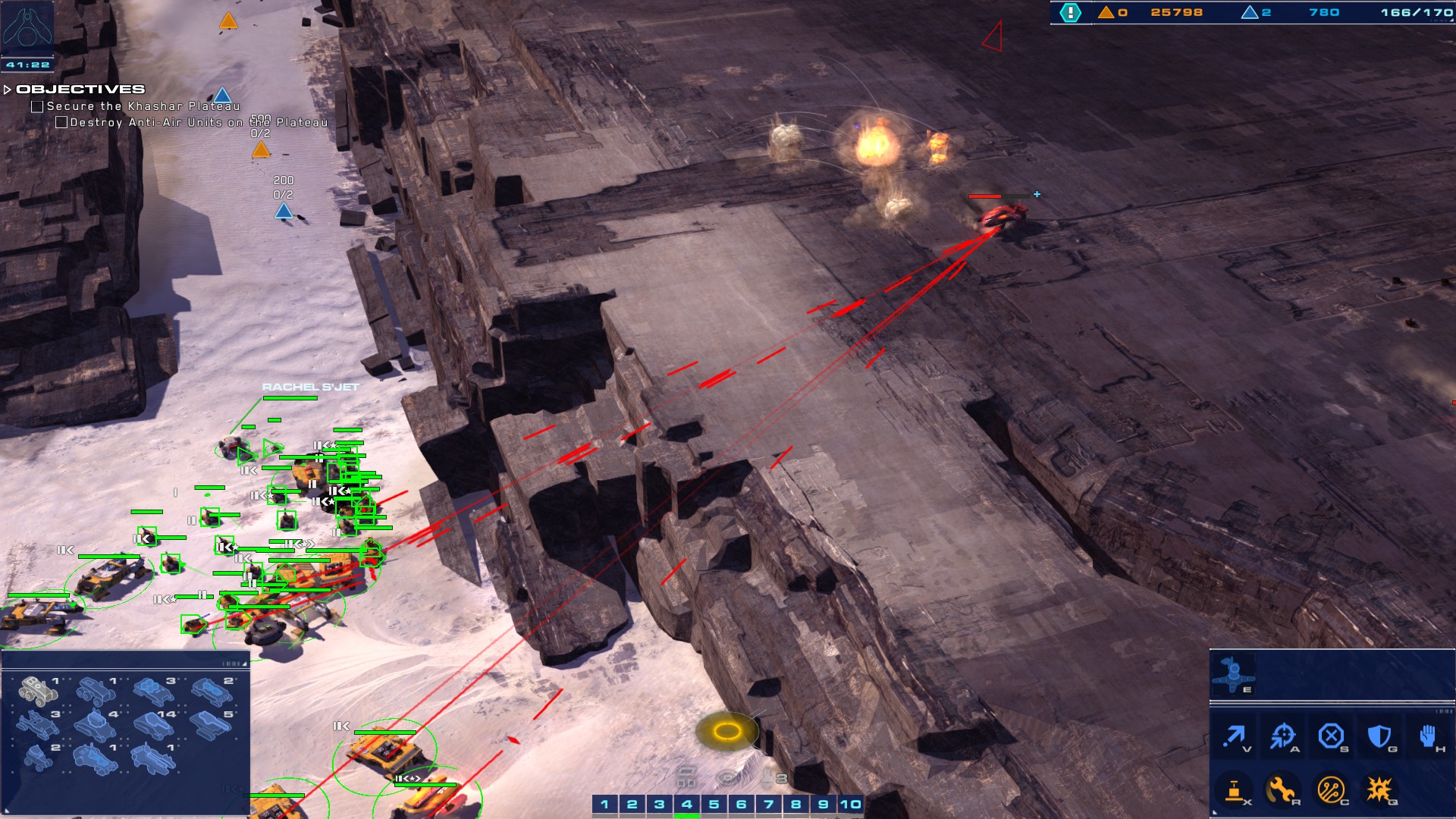 L’aspect stratégique des combats est l’une des grandes forces du jeu. Chaque type d’unité est appropriée pour un style de combat. Les VAL sont par exemple parfait pour se rapprocher rapidement des unités de tirs à longue portée pour pouvoir les neutraliser. Les canons électriques sont eux redoutables à longues distances. Il vous faudra connaitre les forces et faiblesses de chaque unité pour pouvoir les utiliser au mieux. Vos unités gagnent de l’expérience et deviennent plus puissantes par la même occasion, il faut donc en prendre soin. Le terrain est également un élément primordial à prendre en compte lors des escarmouches. Une position élevée vous donnera un avantage non négligeable et pourra largement compenser un faible nombre d’unité. Poster une unité d’artillerie derrière une dune est également un bon moyen de causer de nombreux dégâts tout en étant à l’abri. Les stratégies sont nombreuses et la satisfaction de mener un plan à bien est extrêmement gratifiant.