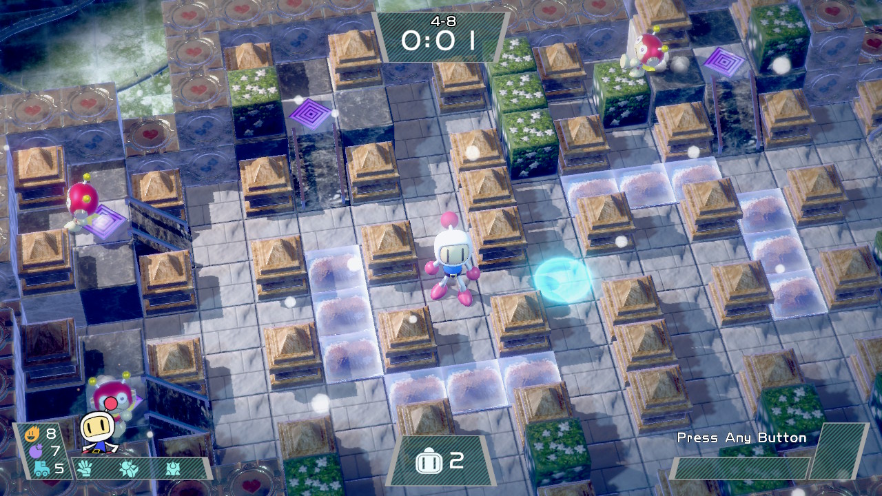 Je n’ai pas essayé le multijoueur de Super Bomberman R avant la nouvelle mise à jour 1.2 du jeu qui a été créée pour stabiliser l’expérience en ligne. Évidemment, cela veut dire que je n’ai probablement pas connu la même expérience que d’autres testeurs qui l’ont essayé quelques jours voire même quelques semaines avant moi. Ce qui veut dire que sur la trentaine de parties que j’ai jouée en ligne, j’ai eu des difficultés à peut-être 2 ou 3 reprises avec des problèmes de latence qui se sont avérés assez mineurs.
