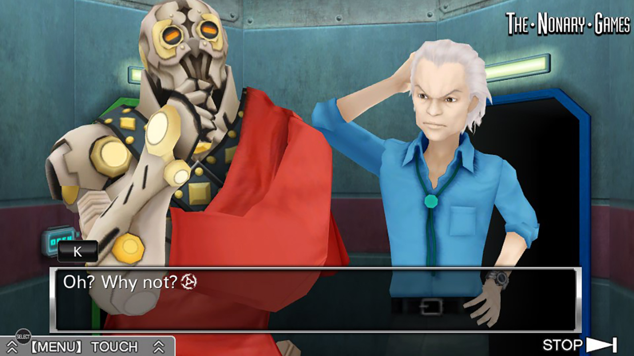 Après s’être réveillé sur un bateau dans des circonstances nébuleuses, notre héros du nom de Junpei tente de comprendre ce qui lui arrive. Mais avant tout, il faudra réussir à sortir de la pièce qui l’emprisonne. C’est à ce moment que vous intervenez, vous et votre esprit de déduction infaillible. En fait, il devra l’être puisque votre survie en dépend. La vôtre ainsi que celle des huit autres personnes qui se retrouvent sur le même bateau que vous. D’ailleurs, comment se fait-il que vous soyez sur un bateau ? Et qui sont ces gens ? Quel est le lien qui vous unit tous ? C’est avec plusieurs questions, mais aucune réponse qu’on se retrouve devant le maître du jeu : Zero. Après une simple explication des règles du jeu, nous voici lâcher dans la nature. Que le jeu commence…