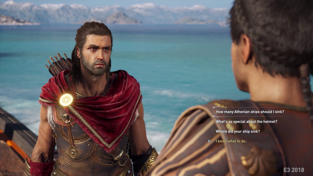 Mais ces choix ne se limitent pas qu’aux actions. Assassin’s Creed Odyssey bénéficie d’un « brand new interactive cinematic dialogue system ». Plus de 30 heures de dialogues ont été incorporées dans le jeu. Cela permet entre autres aux joueurs de discuter avec qui ils veulent et de la façon dont ils le désirent. Dans chaque dialogue, il y a maintenant plusieurs choix de réponses qui nous permettent d’interagir de différentes manières.