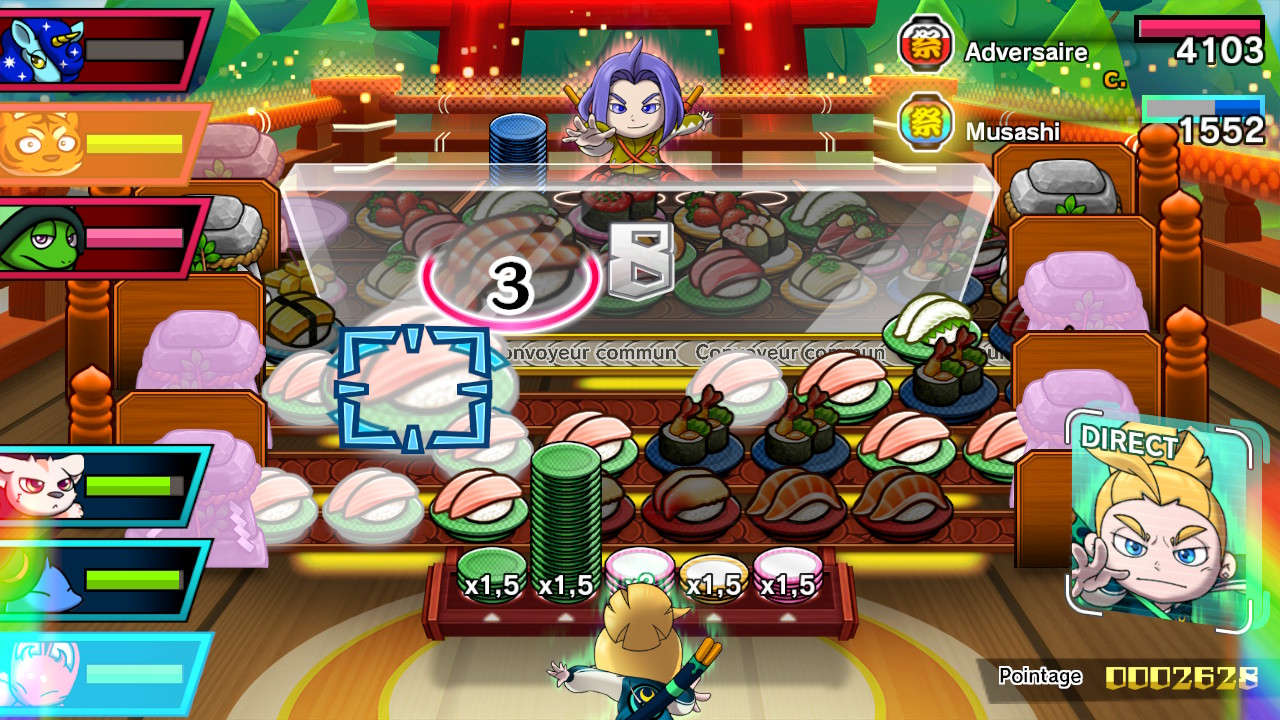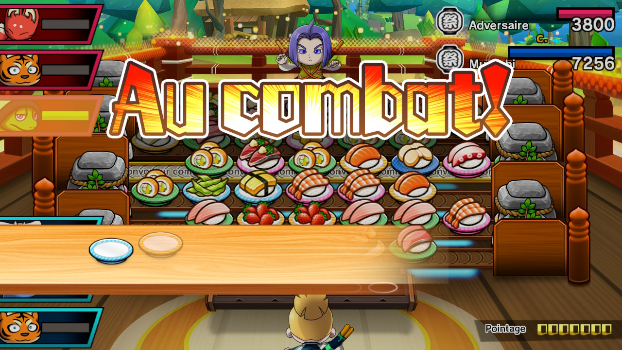 Enfin, il y a même des rouages de tapis qu’on peut installer qui va venir modifier vos convoyeurs. N’oubliez pas non plus de vous choisir un sushi préféré puisqu’il vous donnera des points supplémentaires. En dernier lieu, une fois le combat terminé, on vous attribue un score selon vos piles de sushis et le temps du combat. Plus vous êtes rapides, plus vous avez des chances d’obtenir le classement maximal. Et pour ceux qui veulent tout faire à 100 %, chaque tableau à trois challenges à compléter. Bref, il ne manque pas de contenu.