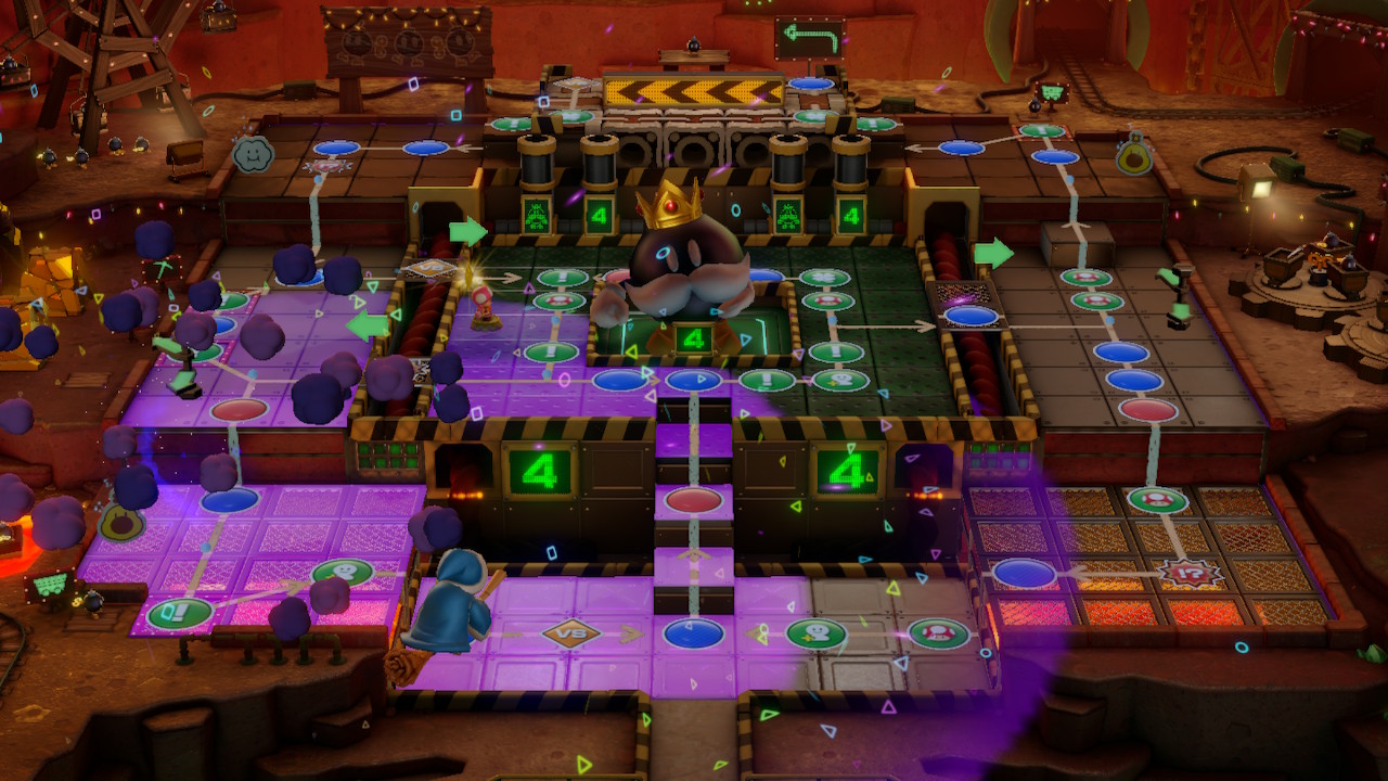 Super Mario Party propose aussi une alternative au mode précédent grâce aux duos. Ainsi, c’est en 2v2 qu’on aborde chaque tableau et qu’on fait tous les minijeux. Or, il y a une différence majeure et la manière dont on se déplace sur le tableau. En effet, chaque joueur roule un dé et peut se déplacer du total des deux. Cependant, au lieu de se promener en suivant une ligne, la grille de chaque plateau nous permet d’aller dans n’importe quelle direction. Ainsi, on a beaucoup plus de flexibilité et ça nous force à penser le tableau d’une nouvelle manière. C’est difficile à expliquer parfaitement à l’écrit, mais je vous invite à l’essayer, car ça fait très différent du mode principal. On a donc bien aimé celui-ci.