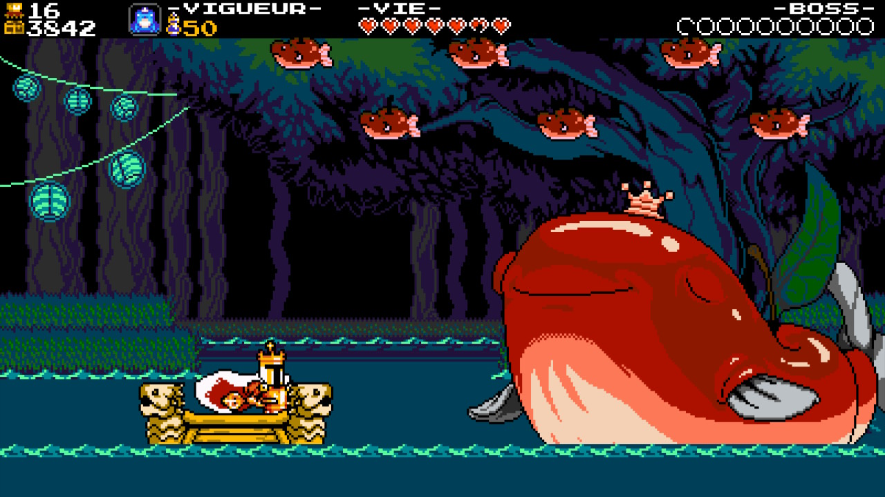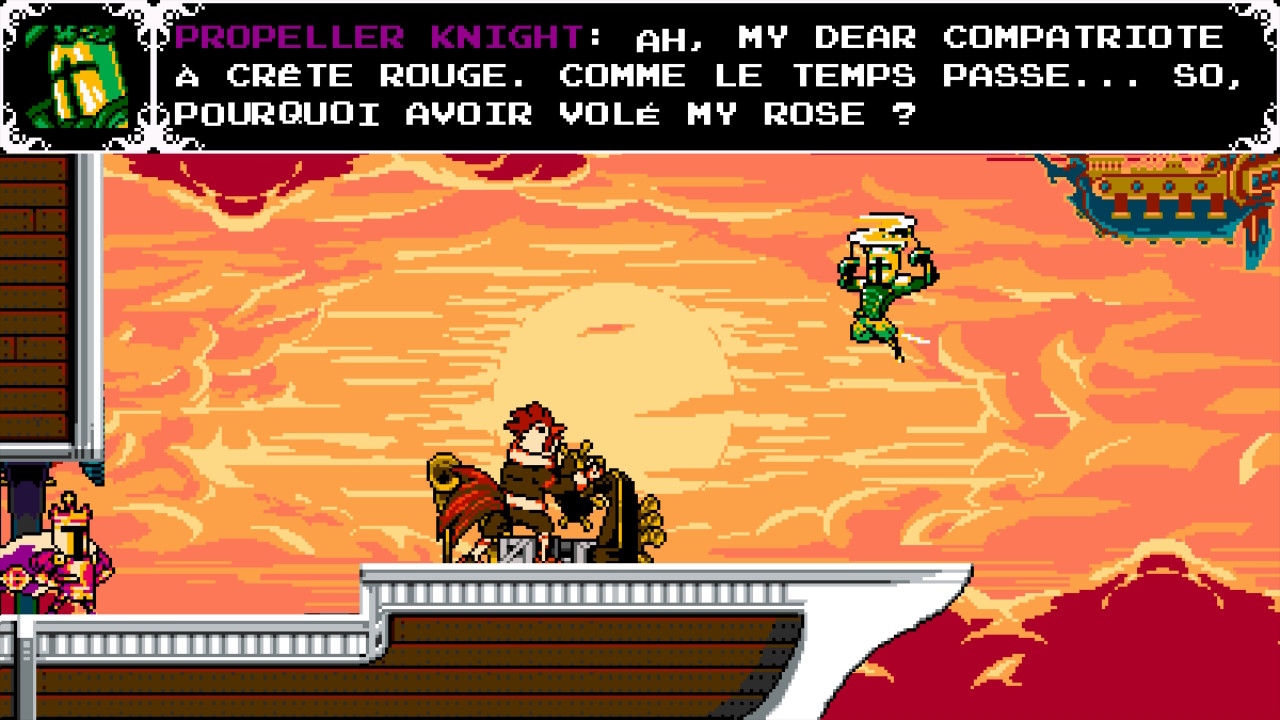 Pour moi, les moments les plus savoureux sont lorsque King Knight interagit avec les nombreux personnages qu’il rencontre. Il a une sorte d’attitude nonchalante qui devient drôle sans qu’il ne vise justement la carte de l’humour. Il joue très naturellement le roi un peu bouffon qui agit comme si tout lui est dû. Et, lorsqu’on le voit dialoguer avec d’autres personnages qui ont aussi beaucoup de personnalité comme Propeller Knight par exemple, le résultat est excellent.