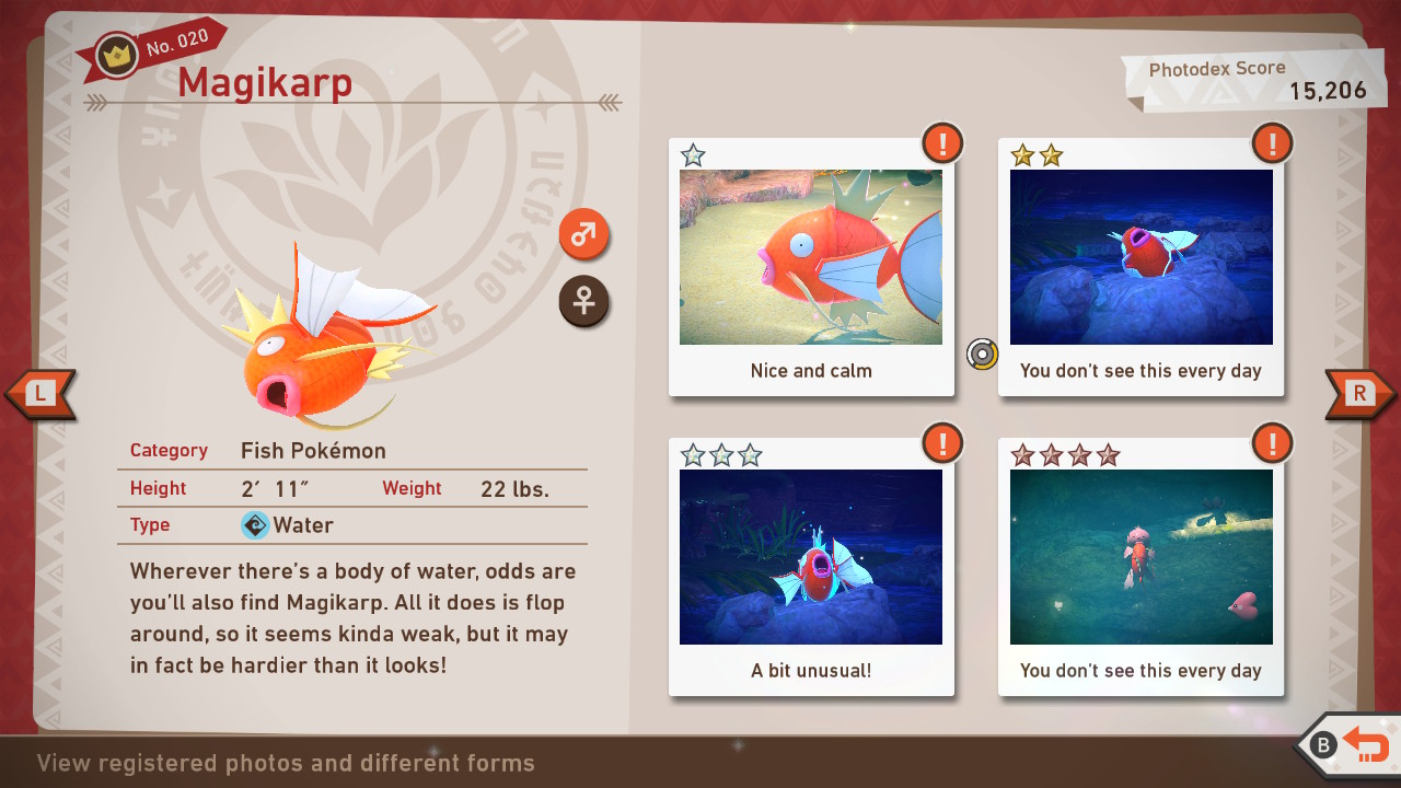 D’ailleurs, la plupart de ces requêtes nous permettent d’obtenir une photo à 4 étoiles ce qui nous donne des points de recherche. En fait, on doit remplir notre album de Pokémons avec une photo de chaque étoile (1 à 4) pour maximiser notre pointage. Il y a même un mode compétitif où on doit obtenir le meilleur pointage durant un parcours et on peut comparer notre score en ligne. Ainsi, plusieurs critères comme la taille ou l’arrière-plan qui vont servir de juge à votre travail de photographe. Bref, l’aventure ne manque pas de contenus pour ceux qui veulent tout compléter.
