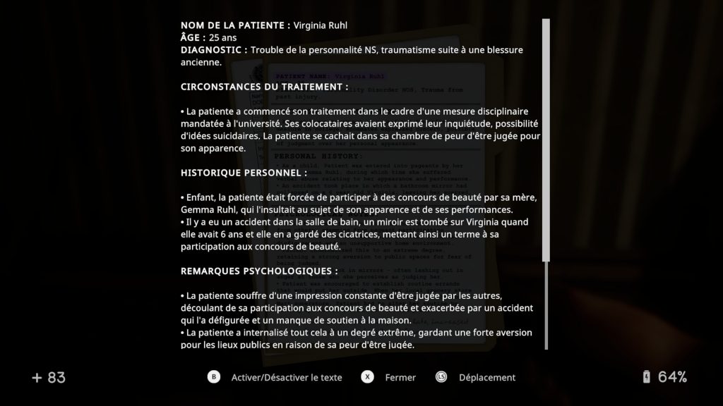 Chaque patient est vraiment intrigant et c’est vraiment intéressant de découvrir son histoire. D’ailleurs, lorsque vous terminez une cassette et que vous retournez à votre bureau pour une discussion avec Tonia, le dossier du patient devient disponible. Vous pourrez donc lire les notes que Desmond a prises du patient et de comprendre complètement son histoire, car en affrontant ses démons, le tout est un peu énigmatique.