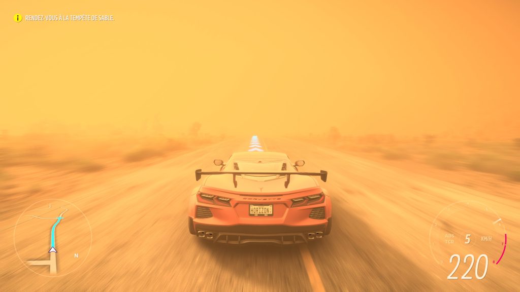 Certaines missions et activités de Forza Horizon 5 offrent aussi quelques changements dans l’environnement avec notamment l’intégration de tempête de sable. Ce type d’évènements est assez impressionnant même si je regrette le fait que ces déclenchements météorologiques ne soient pas disponibles en balade libre. En effet, les gros changements surviennent uniquement lors de missions bien précises et même si la pluie peut venir s’abattre quelques fois, il n’y a pas vraiment de gros changement climatique dans nos balades.