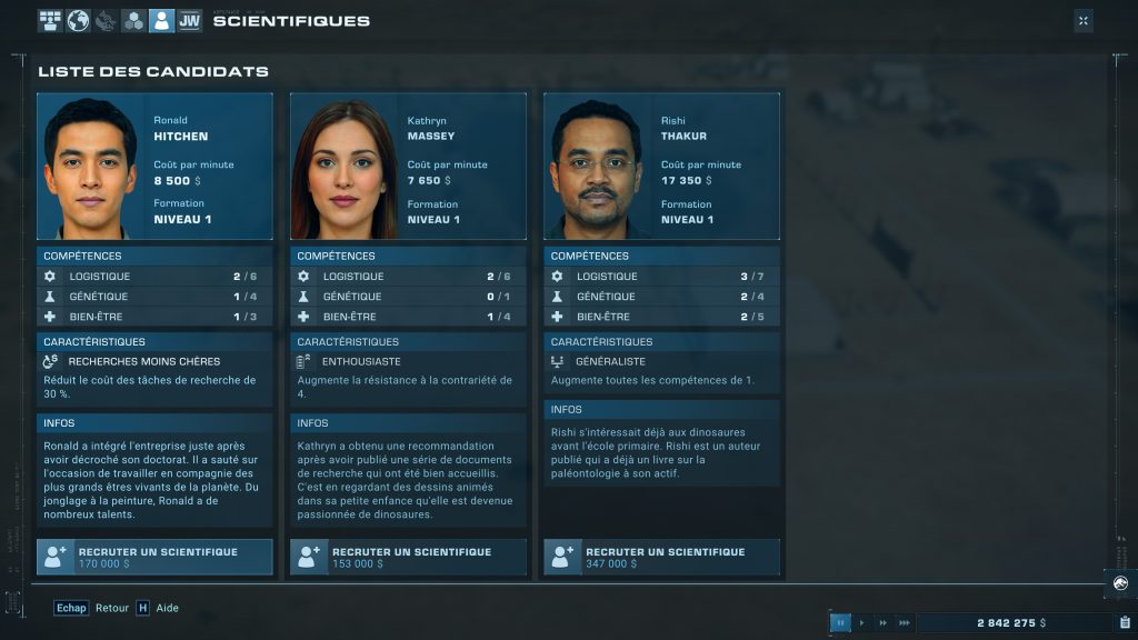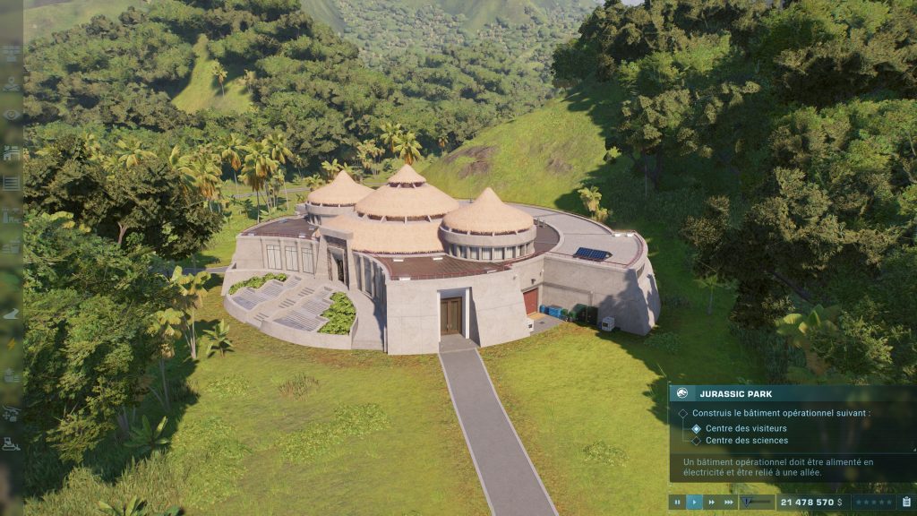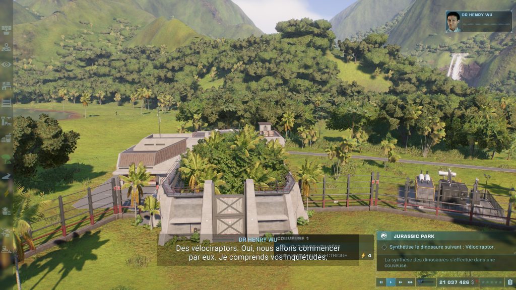 La gestion du parc en tant que telle a aussi évolué dans Jurassic World Evolution 2 avec l’intégration des scientifiques qui propose des caractéristiques particulières pour réussir à attraper des dinosaures un peu partout sur la planète. Il faut, donc, gérer les embauches, mais aussi les compétences de vos nouveaux employés. En effet, chaque scientifique possède des habiletés qui diffèrent et qui sont aussi améliorables. Chaque expédition que vous allez démarrer à l’extérieur de votre parc doit remplir certaines conditions selon l’emplacement ou le type de dinosaure que vous souhaitez capturer. Bien entendu, ces scientifiques doivent prendre des vacances et être payés. Pour cette dernière portion, il faut savoir que le jeu est bien moins punitif que le précédent. Je n’ai jamais eu le besoin de faire un emprunt à la banque même si j’investissais des milliers de dollars dans mes infrastructures. Un point positif, surtout pour les néophytes et ceux qui souhaitent simplement créer le plus beau parc possible. Parmi les autres coûts qu’il faut calculer, il y a la nourriture pour vos créatures, l’essence pour vos équipes de surveillances ou encore l’électricité utilisée par vos générateurs. En principe, si vous investissez de manière progressive vous ne devriez pas avoir de problème d’argent.