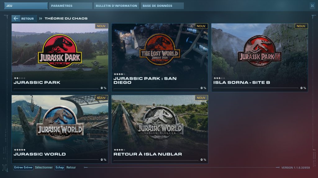 L’une des autres nouveautés de Jurassic World Evolution 2 est le mode Théorie du chaos. Celui-ci est sans doute la portion que je préfère du titre développé par Frontier Developments. Il s’agit de missions dirigées qui permettent de revivre les moments phares des films inspirés de la trilogie Jurassic World et Jurassic Park. Ces missions permettent aussi de déverrouiller des apparences bien particulières issues des longs-métrages pour vos parties libres. Le mode Théorie du chaos prend moins par la main que la campagne solo en plus d’intégrer des fonctionnalités qui n’ont pas été présentées. Les nouveaux joueurs auront sans doute un peu plus de difficulté à comprendre les subtilités de ce jeu de gestion.