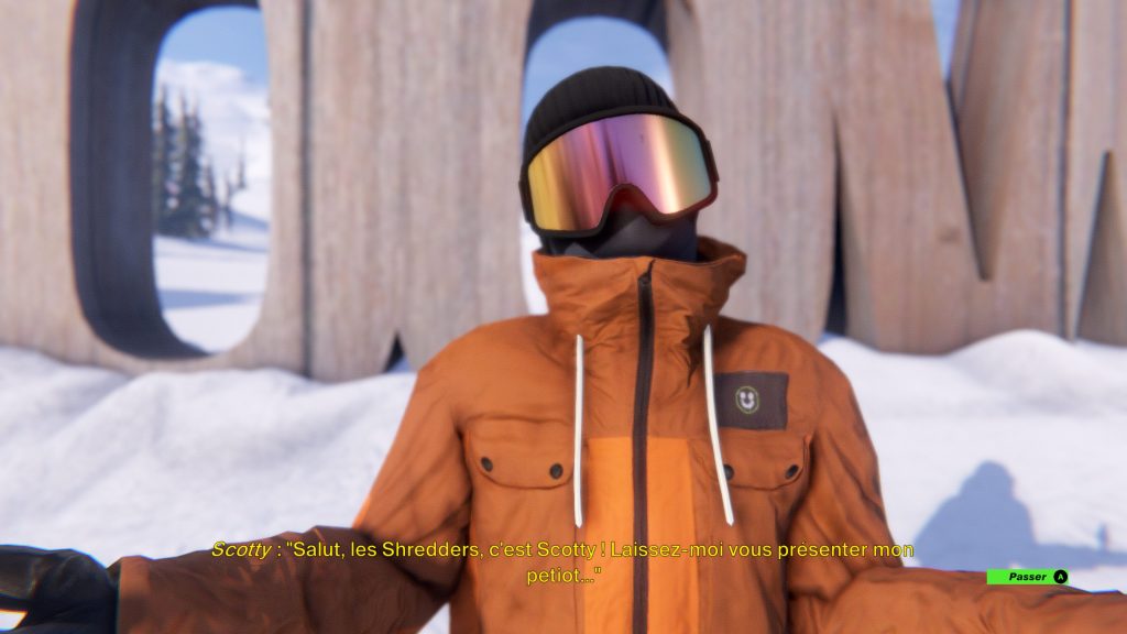 Tel qu’indiqué précédemment, Shredders à un ton beaucoup plus léger et humoristique. Les développeurs du studio FoamPunch tentent d’ailleurs via plusieurs cinématiques de raconter le scénario plus que léger du titre. Nous incarnons un personnage qui se retrouve bien malgré lui à devoir effectué des tours de pistes et de réaliser des figures pour tenter de décrocher une invitation à un événement exclusif qui réunis les meilleurs planchistes du monde. Malheureusement et la plupart du temps, l’histoire est tout à fait inintéressante et nous avons qu’une seule envie est celle de la passer. Je ne cacherai pas qu’après plusieurs minutes, j’ai rapidement compris que l’histoire n’était pas nécessaire et que je pouvais largement m’en passer. J’ai eu l’impression de me retrouver face à un bien mauvais sketch.