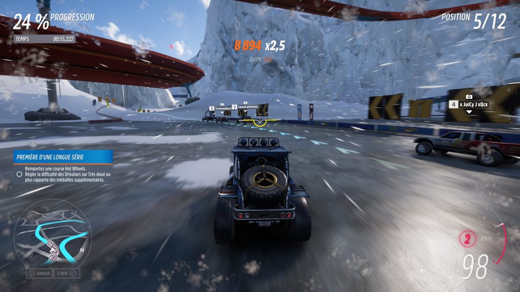 Les développeurs ont aussi ajouté un nouveau réticule tournant comme un gyroscope pour remporter des points supplémentaires afin de remporter des bonus de maîtrise. À ce niveau, le réticule est plus que gênant en plein milieu de l’écran et avec une dimension assez imposante. Si vous le souhaitez, vous pouvez désactiver le réticule dans les options d’accessibilités. Parmi les autres activités, on retrouve une Histoire Horizon exclusive vous racontant les prémisses de la création des Hot Wheels. Une manière interactive d’en apprendre plus sur l’entreprise, même si le tout se termine très rapidement. Il s’agit plus d’une manière de raconter une histoire, qu’une réelle épreuve de course automobile. Au total, il vous faudra un peu plus de 6 heures pour terminer les missions principales. Les plus grands amateurs qui souhaitent avoir le 100 % devront sans doute ajouter le double d’heures pour y parvenir.