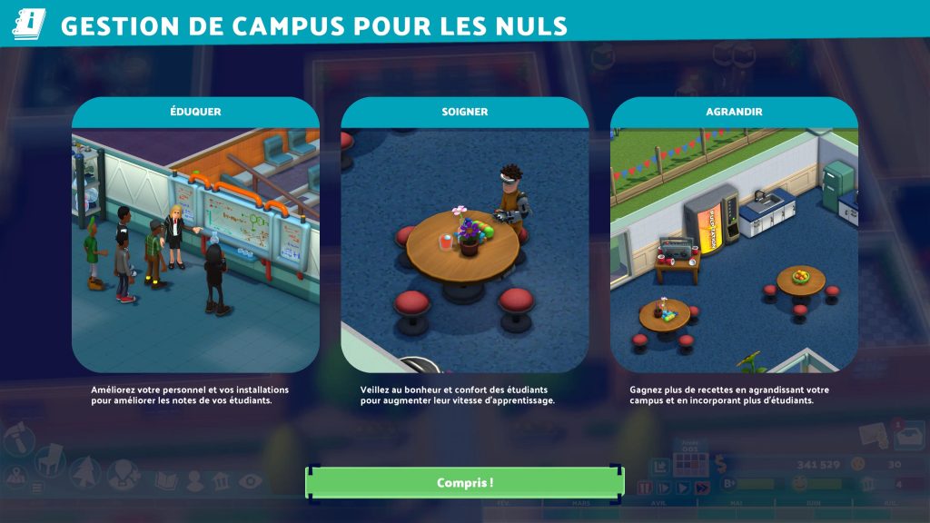 La courbe d’apprentissage n’est pas trop difficile et vous allez prendre un malin plaisir à débuter la création de vôtre université. Pour faire simple, vous serez amenez à créer des zones différentes sous forme de quêtes et d’objectifs. Vous n’êtes pas laissés à vous-même.