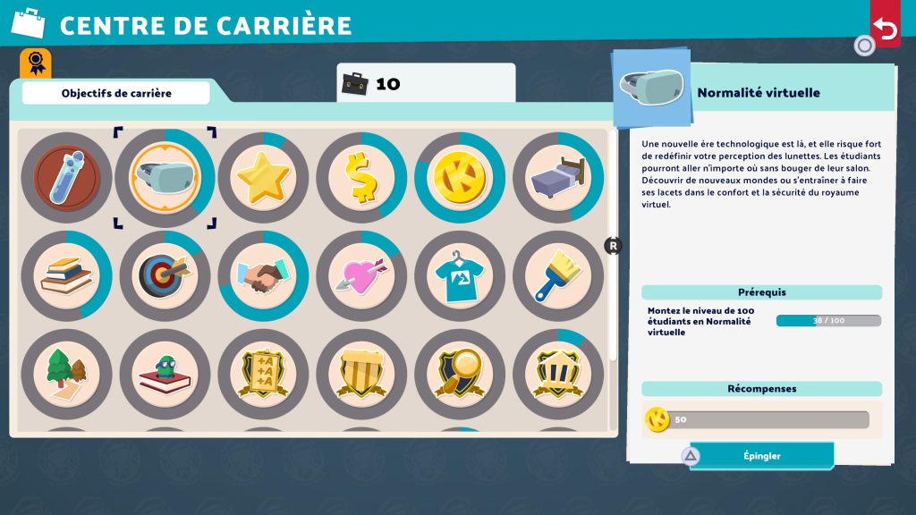 Ce qui est bien avec Two Point Campus, c’est qu’on est encouragé à progresser. Qui plus est, vous serez récompensé pour chaque objectif atteint en plus des tâches demandées. Autant vous obtiendrez de l’argent pour débloquer des items, autant vous pourrez vous comparer à vos paires.