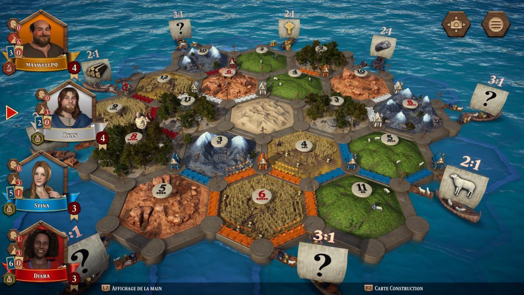 Vous pourrez voir votre main en appuyant sur L2, construire vos routes, villes et colonies avec R2 tout comme pour les cartes de développement. Une fois le tout maitrisé, vous pourrez partir à l’aventure et devenir le maitre du troc et du développement des ressources.