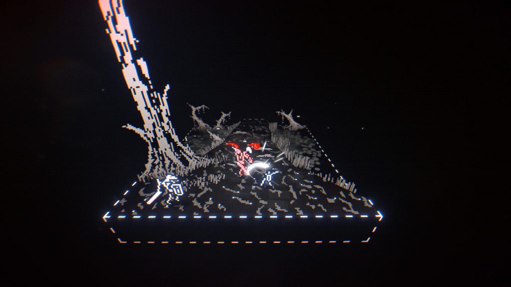 Le dernier et non le moindre constat, l’espace dans lequel nos combats auront lieu. On se trouve dans une espèce de petit cube du style diorama et on devra vaincre les ennemis qui nous font face. C’est tout de même étrange de voir cela lorsque l’on se trouve devant un grand écran télé ou même sur la console en mode portable mais c’est ce qui fait absolument tout son charme. Surtout que le jeu repose essentiellement sur trois couleurs, soit le noir, le blanc et le rouge. C’est visuellement superbe et au risque de me répéter, j’adore cela.