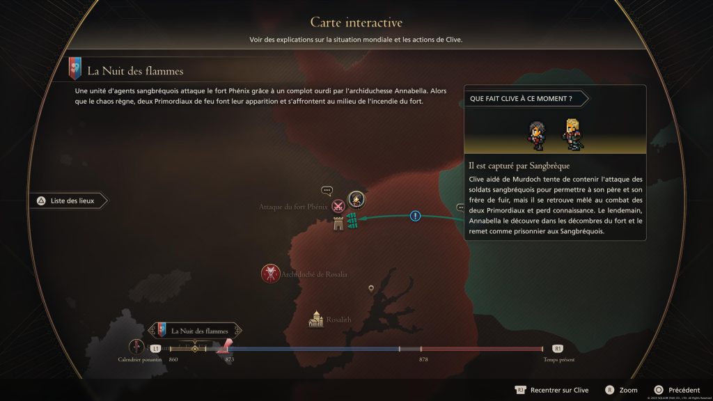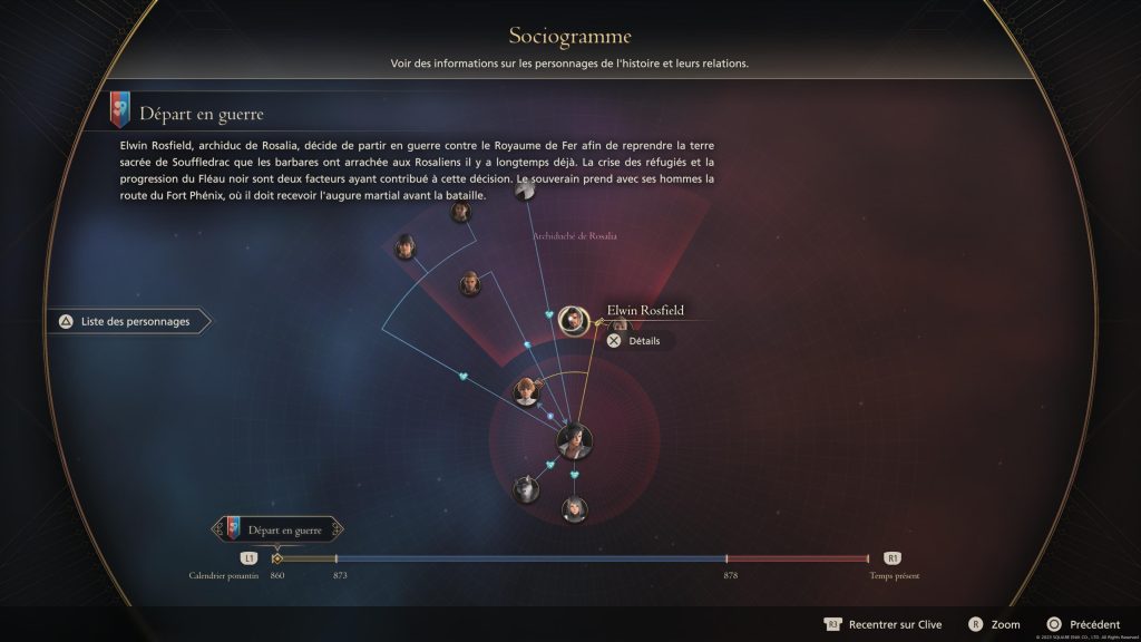 Depuis longtemps, l’histoire principale des jeux de la série Final Fantasy est complexe. Ici, pour FFXVI, c’est encore le cas. Heureusement, tout au long du jeu, vous allez pouvoir consulter une carte interactive, un sociogramme ou encore, discuter avec un bibliothécaire qui détient toutes les informations possibles. C’est extrêmement bien fait et vous pouvoir le voir sur les images ci-dessous. Pour ne rien divulgâcher, j’ai pris ces captures d’écran au début du jeu.