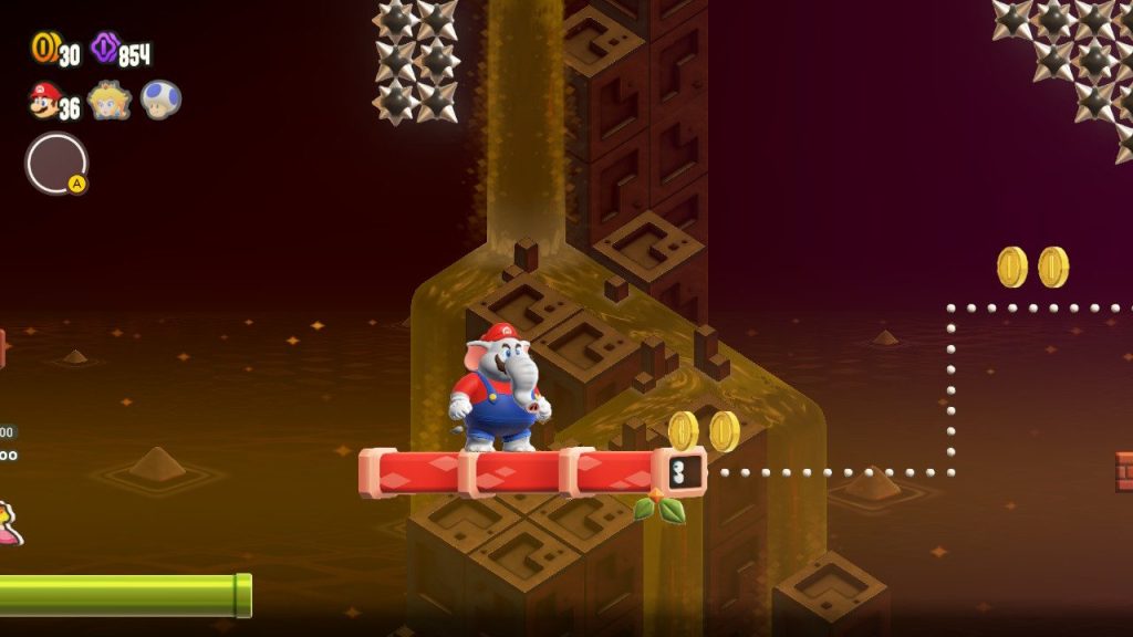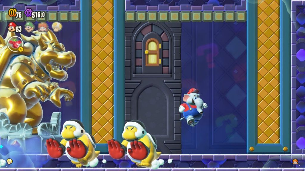 Ensuite, le studio a vraiment bien peaufiné tout ce qui est animation des personnages. Ça va des choses les plus complexes aux plus petits détails. Par exemple, j’adore voir mon petit bonhomme sauter dans un tuyau à pied joint en pliant les genoux. Et, tout ça est ajusté selon la transformation de notre personnage. C’est particulièrement drôle de se voir être partiellement coincé dans le même tuyau lorsqu’on est un gros éléphant. Je trouve ça génial.