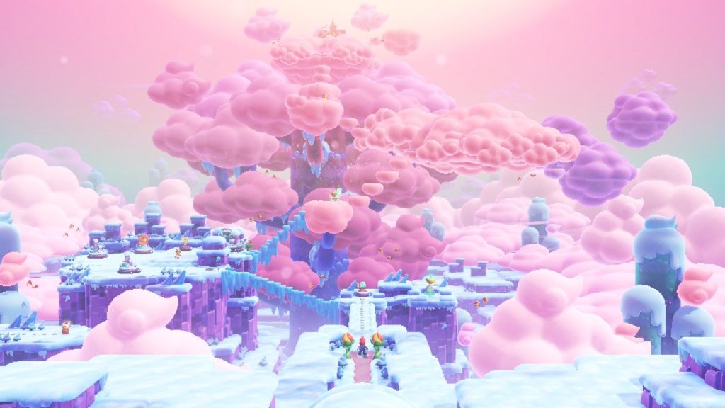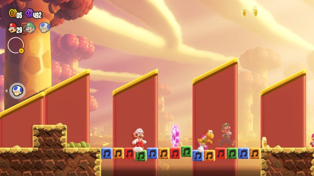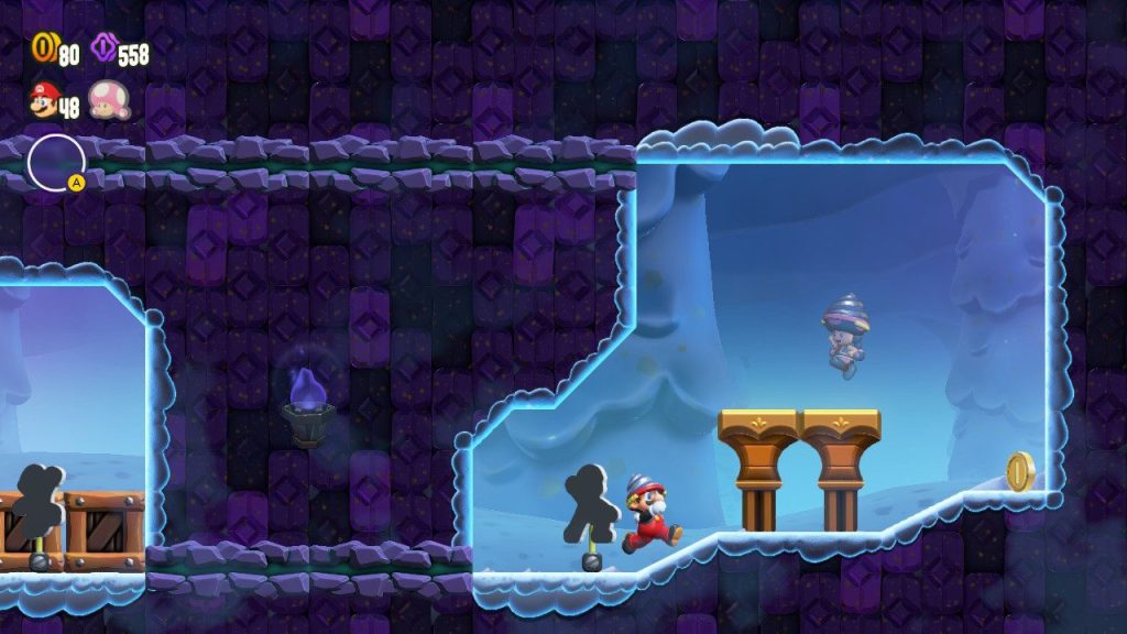 Outre les multiples graines, trois pièces violettes se cachent dans chaque tableau. Celles-ci sont échangeables contre des panneaux de chaque personnage à collectionner, des champignons 1-UP, des graines prodiges et des badges. Si elles sont quand même relativement visibles, elles sont rarement facilement atteignables. C’est une belle manière de prolonger l’aventure et de passer un peu plus de temps dans chaque tableau.