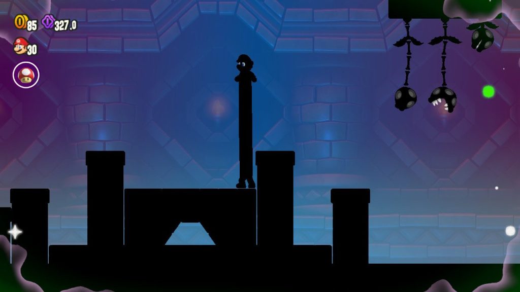 J’ai parlé des pouvoirs de Super Mario Bros. Wonder, mais ce ne sont pas les seules transformations. Dans presque chaque tableau, il y a une graine prodige à obtenir qui transforme temporairement complètement le tableau et parfois même notre personnage.