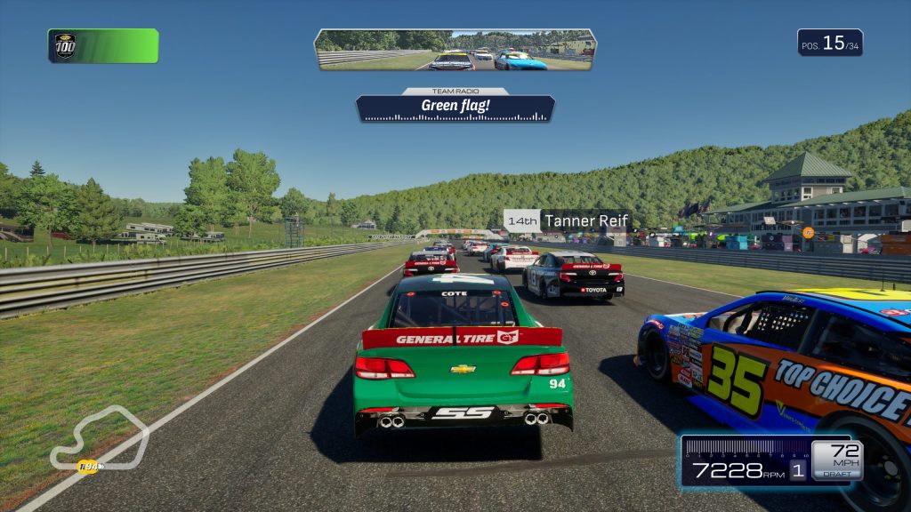 Sur le plan visuel, NASCAR 25 est solide sans être spectaculaire. Les modèles de voitures sont fidèles et les circuits bien modélisés. De son côté, si l’éclairage de jour fonctionne parfaitement, la gestion des lumières le soir fait défaut. On a cette impression que les courses de nuit réduisent considérablement la qualité visuelle du jeu. Les reflets sont tout à coup moins réalistes et les couleurs un peu moins fidèles. Heureusement, les effets de vitesse sont réussis, notamment grâce au travail sur la caméra embarquée. Les communications radio ajoutent aussi de l’immersion. On sent que le studio a voulu livrer un produit abouti, mais que certaines priorités ont été mises de côté.