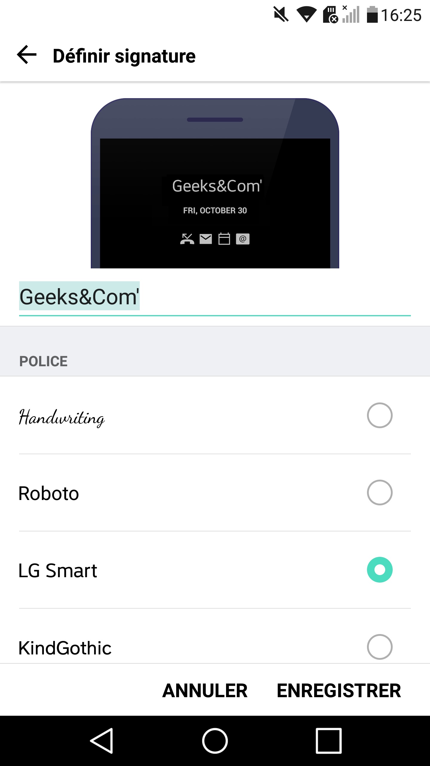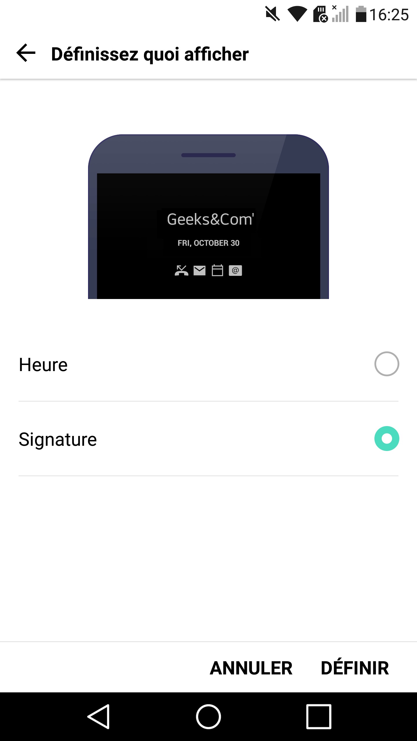 Côté personnalisation, LG s’est également contenté du minimum. Il est seulement possible de choisir d’afficher l’heure ou une signature personnalisée de 10 caractères, en plus des notifications reçues. Il n’est donc pas ici question d’avoir une image colorée ou de nombreux styles d’horloges, le mot d’ordre est sobriété est discrétion.