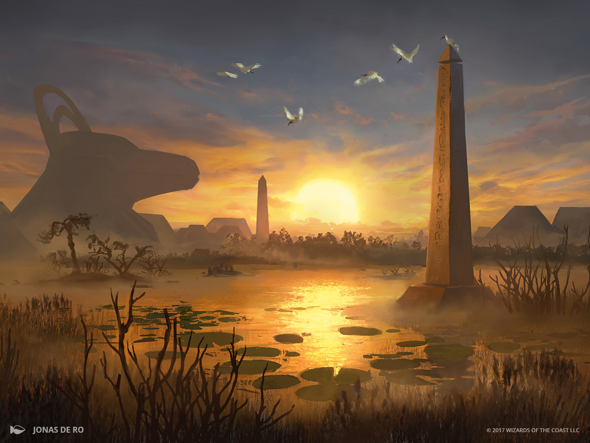 « Amonkhet est un monde composé d’un désert infini, en proie à des momies en maraude, des guivres des sables affamées, des démons malveillants et de nombreuses autres terreurs inimaginables. Un phénomène néoromantique appelé la Malédiction d’errance a pour effet de redonner vie à toute créature mourant en Amonkhet sous la forme de momie morte-vivante.
