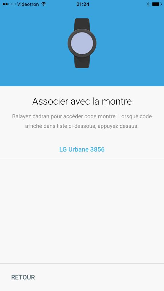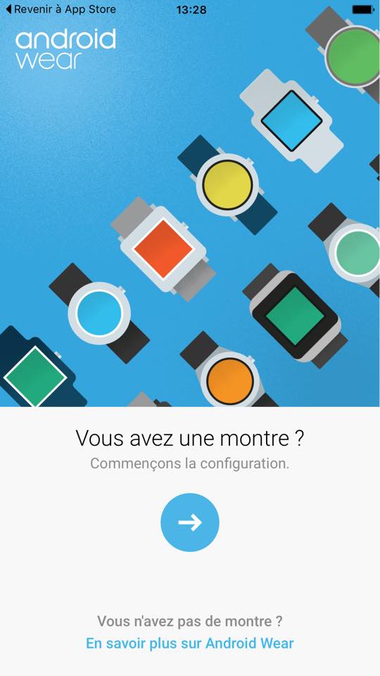 Comme sur Android, la première étape avant de pouvoir utiliser un produit Android Wear consiste à télécharger l’application du même nom et à appairer l’objet en bluetooth avec son téléphone. Le tout est bien évidemment très simple et bien indiqué, la principale différence étant le passage par l’App Store plutôt que par le Play Store.
