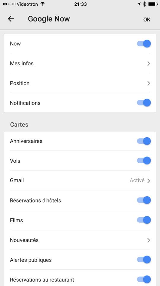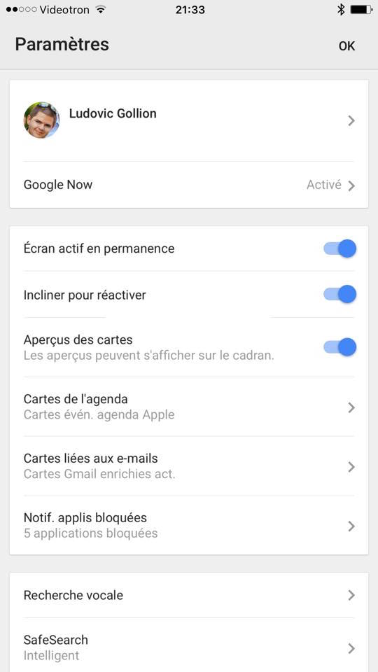 Comme sur Android, les possibilités d’affichage des notifications sont nombreuses. On peut ainsi choisir quelles applications n’auront pas le droit d’afficher des notifications sur la montre, ainsi que sélectionner les cartes de Google Now qui nous intéressent ou pas.