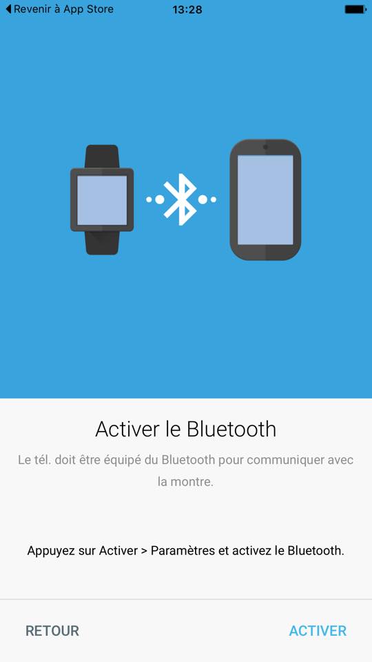 La montre est immédiatement reconnue pour peu que le bluetooth soit activé, et l’appairage se réalise en quelques secondes. À noter que bien que l’application soit capable de distinguer que le bluetooth n’est pas activé, elle ne peut l’activer d’elle même, même lorsque l’on appuie sur le bouton. Il s’agit d’une limitation pour raison de sécurité de la part d’Apple, qui oblige à passer par les réglages de l’appareil.