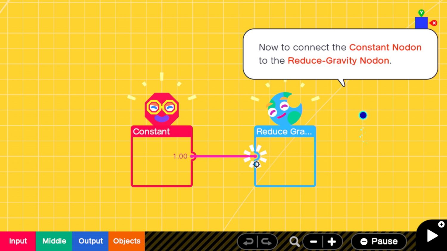 Le grand secret derrière le titre, ce sont les Nodons. Au total, il y en a plus de 80 et dans le jeu ils sont représentés par de petits personnages au corps en forme de cube. Chacun d’eux représente une fonction qui est primordiale pour créer votre planche de jeu. Par exemple, un peut servir de personnage, alors qu’un autre représente un bouton de Joy-Con, une constante ou une fonction comme réduire la gravité. Il suffit ensuite de relier les Nodons entre eux pour qu’ils interagissent et deviennent fonctionnels.