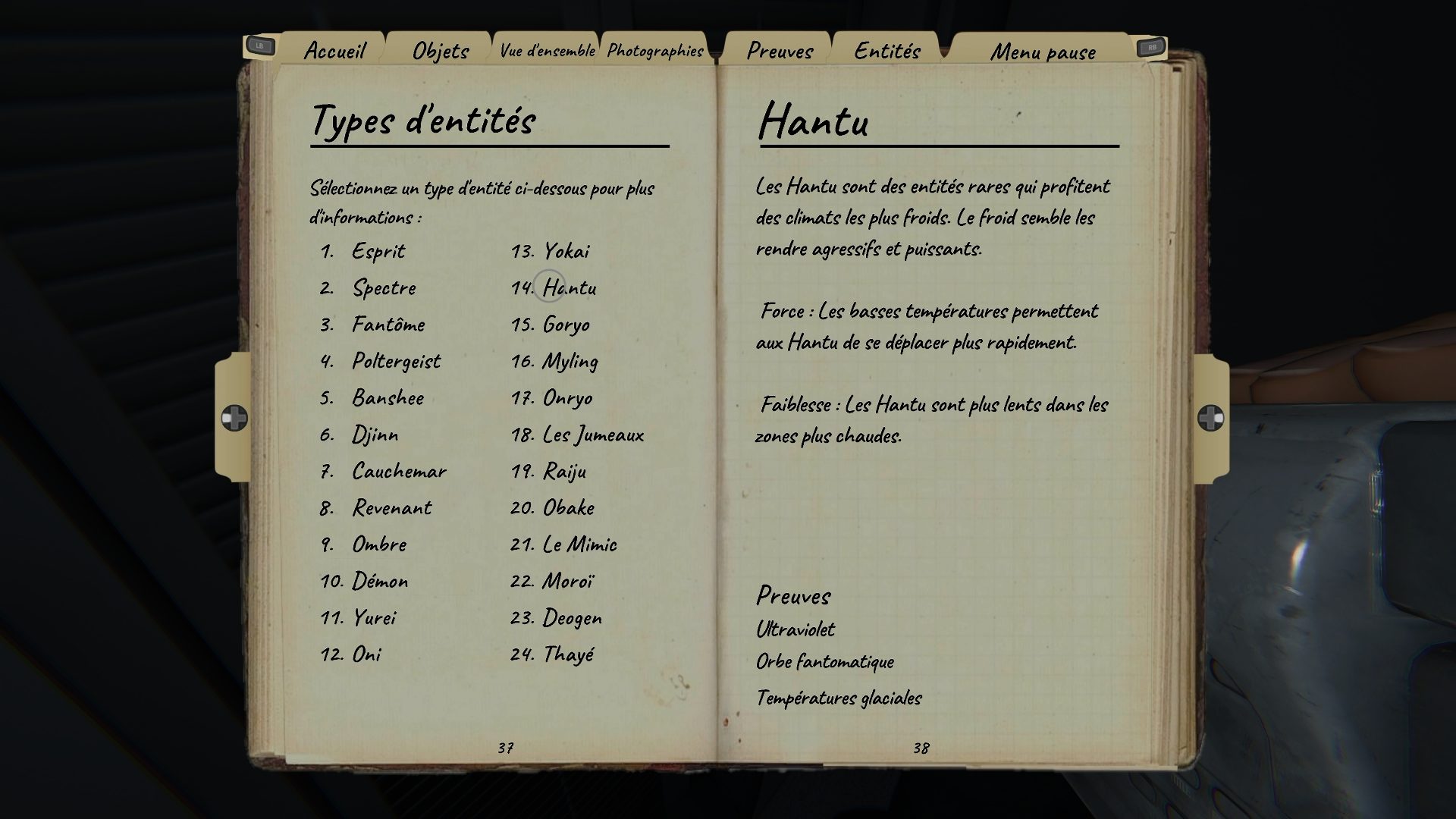Chaque fantôme a ses particularités.  Il y en a 24 différents.  Certains font baisser drastiquement la température tandis que d’autres laissent des marques visibles avec un Ultraviolet.