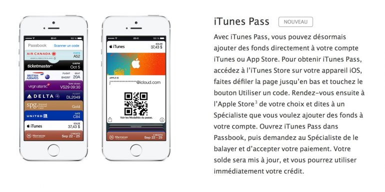 Cependant, Apple vient d’annoncer une nouvelle option dans l’iTunes Store sur les appareils iOS et Passbook : iTunes Pass. Cette nouvelle possibilité est déjà disponible dans plusieurs pays notamment en France et au Canada. Pour l’utiliser, il suffit d’aller dans le bas de l’app iTunes Store, puis choisir l’option pour entrer un code de carte cadeau et dans le bas, ajouter la carte dans Passbook.