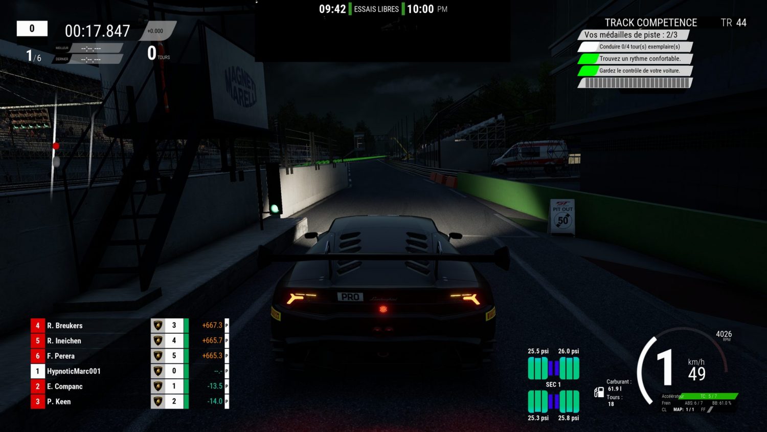 Parmi les modes de jeu proposé par Assetto Corsa Competizione, on y retrouve un mode carrière plutôt classique. Tout d’abord, on doit réaliser des tests afin d’être recruté parmi l’une des équipes du championnat Blancpain GT Series. Par la suite, il sera possible de participer aux différentes courses officielles. Néanmoins, le tout reste assez simple et assez impersonnels. Malgré la présence d’un premier test qui permet de proposer au joueur un niveau de difficulté et les aides au pilotage à activer, le titre ne propose pas vraiment de didacticiel a proprement parlé. Le mode carrière en lui-même propose pratiquement qu’un enchaînement de course pendant plusieurs saisons. J’aurai aimé avoir un peu plus d’immersion alors qu’au niveau de la conduite, il n’y a rien à redire de ce côté.